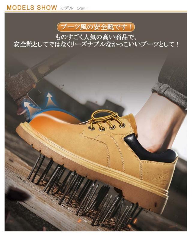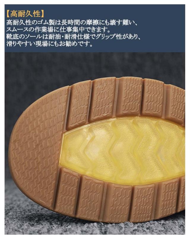 | これなら作業服でも私服でもOKな感じ! ブーツ風の安全靴です! ものすごく人気の高い商品で、安全靴としてではなくリーズナブルなかっこいいブーツとして! 【安全性能】1.つま先保護:つま先部分に鋼製の先芯を入れた、金槌や刃物などからつま先を保護できます。2.足裏保護:靴底は防弾材料ケブラー繊維ミッドソールが入れた、釘などの鋭いものから足裏を守ります。 【防水性】靴底から高さ約3cm、雨の日の水溜りも安心して歩けます。突然の雨でもしっかり対応できます。孔は水滴より小さく、水蒸気の分子より大きいので、水はとおさ通さず汗の湿気を外に放出します。 【高耐久性】高耐久性のゴム製は長時間の摩擦にも壊す難い、スムースの作業場に仕事集中できます。靴底のソールは耐油・耐滑仕様でグリップ性があり、滑りやすい現場にもお勧めです。 | |