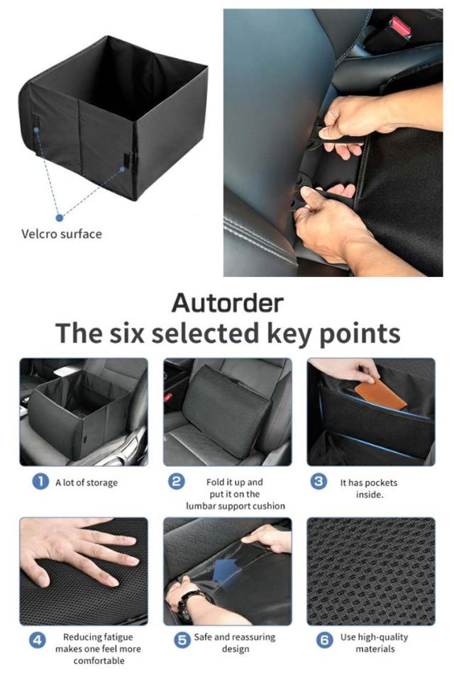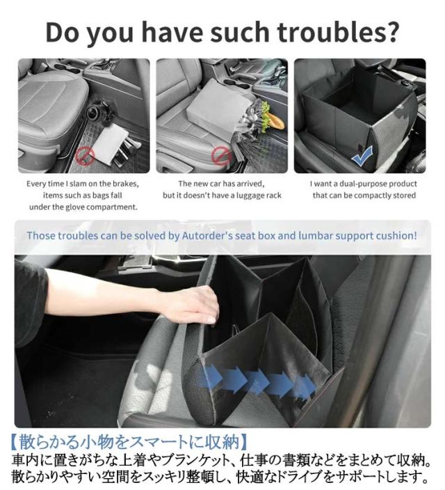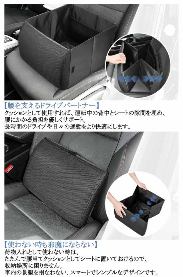 | 1つで2役の多機能設計!折りたたみシートボックス。【蓋付き】 【1つで2役の多機能設計】 普段は快適な「腰当てクッション」として、広げれば「収納ボックス」にに早変わり。車内のあらゆるニーズにこれ一つで応えます。 【買い物の荷崩れを徹底ガード】 助手席や後部座席に置いた買い物袋やバッグが、ブレーキやカーブで倒れて中身が散乱…そんなお悩みを解決!ボックス型にすれば、大切な荷物をしっかりホールドし、運転に集中できます。 【散らかる小物をスマートに収納】 車内に置きがちな上着やブランケット、仕事の書類などをまとめて収納。散らかりやすい空間をスッキリ整頓し、快適なドライブをサポートします。 【腰を支えるドライブパートナー】 クッションとして使用すれば、運転中の背中とシートの隙間を埋め、腰にかかる負担を優しくサポート。長時間のドライブや日々の通勤をより快適にします。 【使わない時も邪魔にならない】 荷物入れとして使わない時は、たたんで腰当てクッションとしてシートに置いておけるので、収納場所に困りません。車内の景観を損なわない、スマートでシンプルなデザインです。 | |