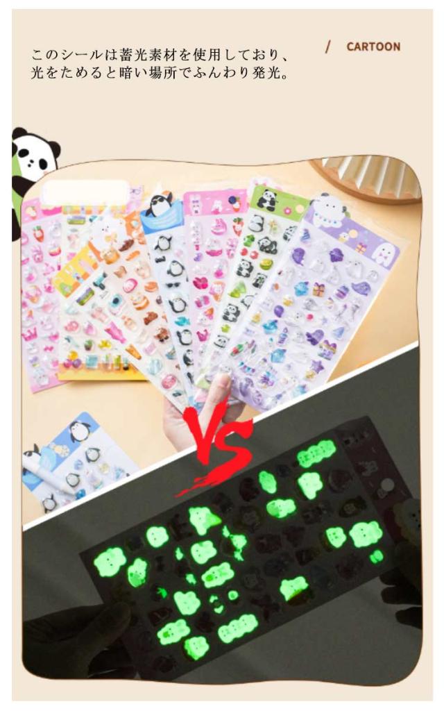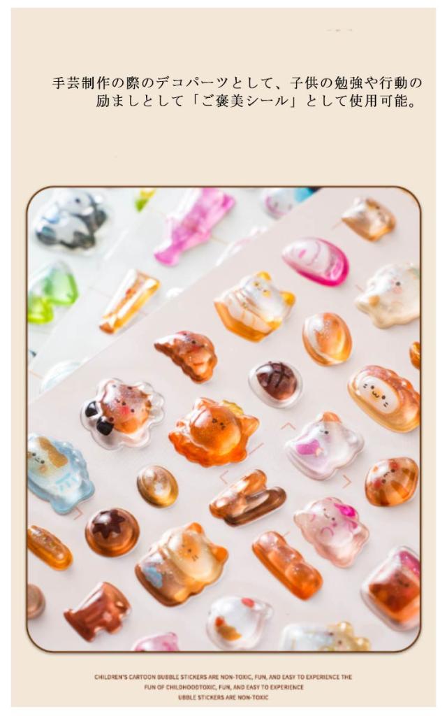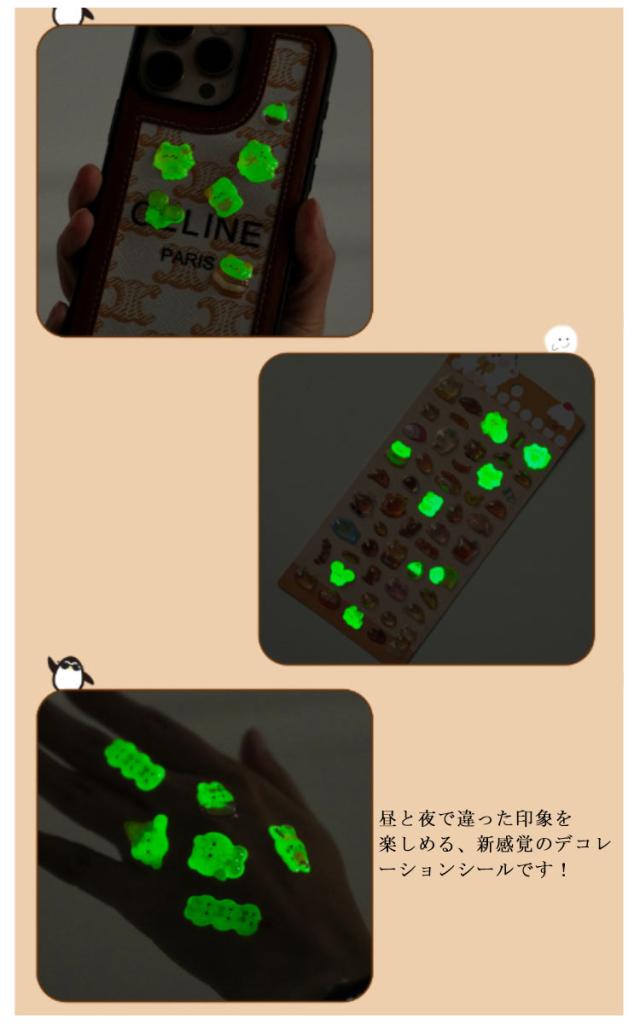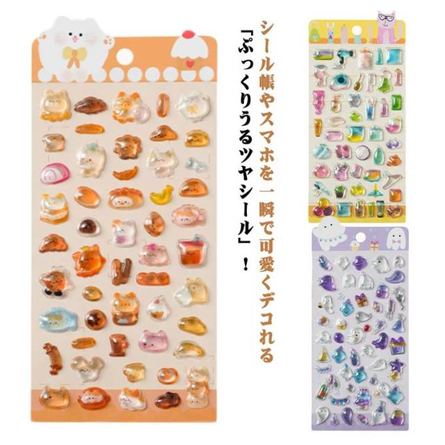 | シール帳やスマホを一瞬で可愛くデコれる「ぷっくりうるツヤシール」! 立体感のあるぷっくり加工と、光でキラッと輝くうるツヤ質感が魅力です。 このシールは蓄光素材を使用しており、光をためると暗い場所でふんわり発光。 昼と夜で違った印象を楽しめる、新感覚のデコレーションシールです! 手芸制作の際のデコパーツとして、子供の勉強や行動の励ましとして「ご褒美シール」として使用可能。 | |
