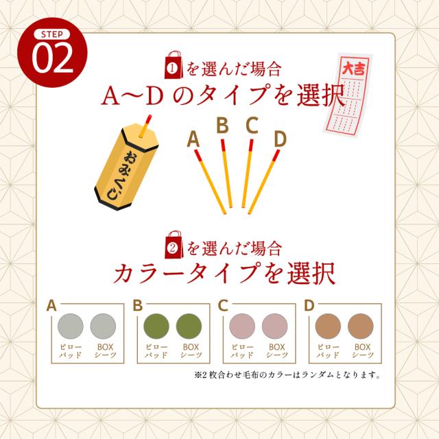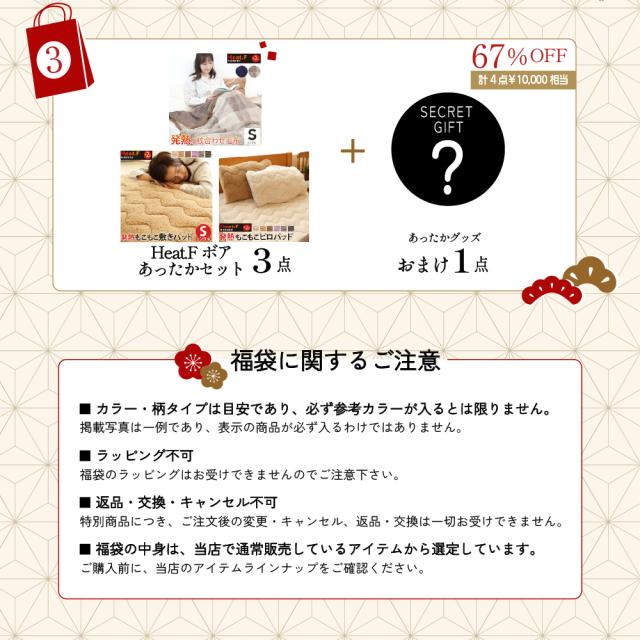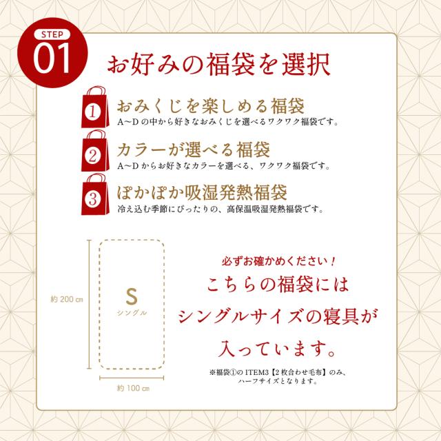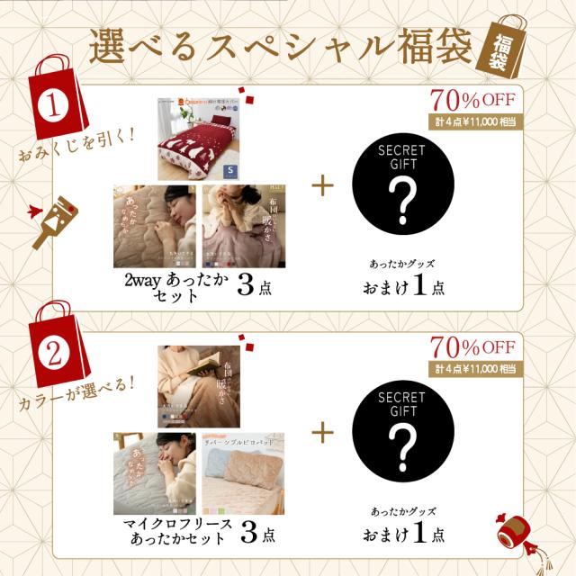 ぬくもりも質感も、冬の“ほしい”を自由に選べる寝具福袋。 シングルサイズ限定の特別セットです。 STEP 1:お好みの福袋タイプを選択 1.おみくじが楽しめる福袋 2.カラーが選べる福袋 3.ぽかぽか吸湿発熱福袋 STEP 2:選んだ福袋に応じてタイプを選択 1.(おみくじ福袋)を選んだ場合:A〜Dタイプから選択 2.(カラーが選べる福袋)を選んだ場合:A〜Dのカラータイプから選択 【1.おみくじを楽しめる福袋_セット内容】 1.フリース掛け布団カバー 2.マイクロフリース敷きパット 3.フランネル2枚合せ毛布(HALF SIZE) 4.Secret Gift(お楽しみアイテム) 【2.カラーが選べる福袋_セット内容】 1.マイクロフリースBOXシーツ 2.マイクロフリースピロパット 3.フランネル2枚合せ毛布(SINGLE SIZE) 4.Secret Gift(お楽しみアイテム) 【3.ぽかぽか吸湿発熱福袋_セット内容】 1.シープ調ボア敷きパット 2.シープ調ボア枕カバー 3.2枚合せボア毛布 4.Secret Gift(お楽しみアイテム) |