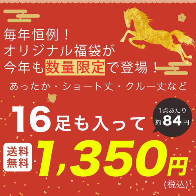 ●2026年レディース靴下福袋!今年も奮発して登場!レディース靴下が16足入った福袋。もちろん、日本全国送料無料!1足あたりなんと約84円でお手元に届いちゃう! ●いますぐ使えるアイテムから次シーズンまで♪レディース靴下を盛だくさんでお届け!どんなセット内容かはお楽しみ♪ ※画像は商品の一部です。画像以外のソックスも入っております。 |