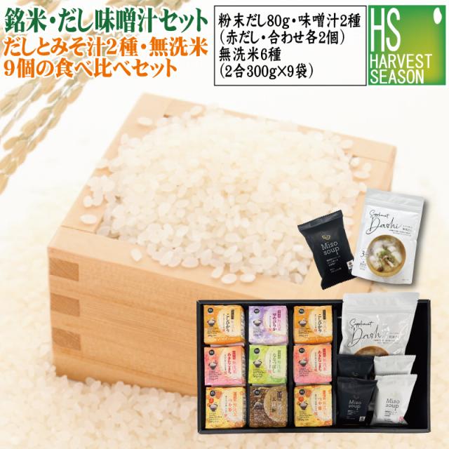 敬老の日 御歳暮 [味噌汁・だし・銘米セット] ギフト 食べる味噌汁(赤だし/合わせ味噌)各2 +なんでも和風だし+無洗米300g 6種 令和7年産(魚沼コシヒカリ/山形こまち/つや姫/各2、ななつぼし/ゆめぴりか/玄白/各1)