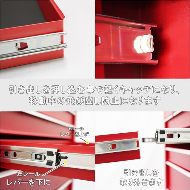 収納力アップ&大型キャスター採用! 新しくなった「艶なし」5段キャビネット ●収納力抜群のキャビネット5段です ●メカニックやDIYなど、整備工具や修理道具の整理整頓に ●小さな傷が目立ちにくい、落ち着いた雰囲気の「艶なし」タイプ ●新しくなったキャスターは大型で高級感のあるデザイン ●樹脂車輪は丈夫で転がりやすく、自在キャスター(2個)はストッパーが付いています ●引き出しは全てベアリングレールを使用し、スムーズに動きます ●引き出しを押し込む事で軽くキャッチになり、飛び出し防止になります ●天板部分にゴムマット/引き出し部分に中敷きマットが付いています ●キーにより全段ロック可能 ●握りやすい丸ハンドルは左右どちらでも取り付けできます ●KIKAIYAロゴステッカー付き ※取っ手・キャスターはお客様での取付けとなります (取付け工具はお客様でご用意下さい) ※工具は付属しません 【交換用部品(別売り)】 ☆自在キャスター(2個セット) ☆固定キャスター(2個セット) ☆キャビネット5段 リンクル塗装(黒)もございます 品番:TBM-5RN |