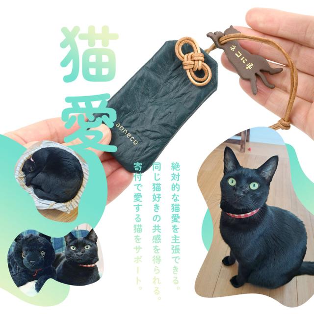 猫好きデザイナーの溢れんばかりの猫愛がカタチとなった革小物。持ってるだけでネコ好きを主張できて、ネコ好き同士の「あなたも?」を瞬間的に引き出すことができて、お買い物すると愛するネコへのチャリティー(寄付)にもなる。猫好きによる、猫好きのための、猫の小物。それが、aoneco(アオネコ)のねこ御守りなのです。