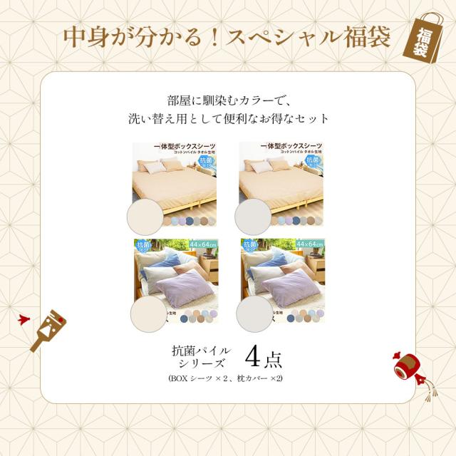 健やかな眠りをサポートする、スペシャル福袋。 やわらかい綿100%抗菌パイル素材で、毎日清潔・快適にお使いいただけます。 【セット内容】 部屋に馴染むカラーで洗替用として便利なお得なセット 1.抗菌パイルBOXシーツ(アイボリー) 2.抗菌パイルBOXシーツ(エクリュグレー) 3.抗菌パイル枕カバー(アイボリー) 4.抗菌パイル枕カバー(エクリュグレー) |