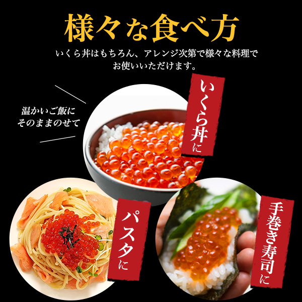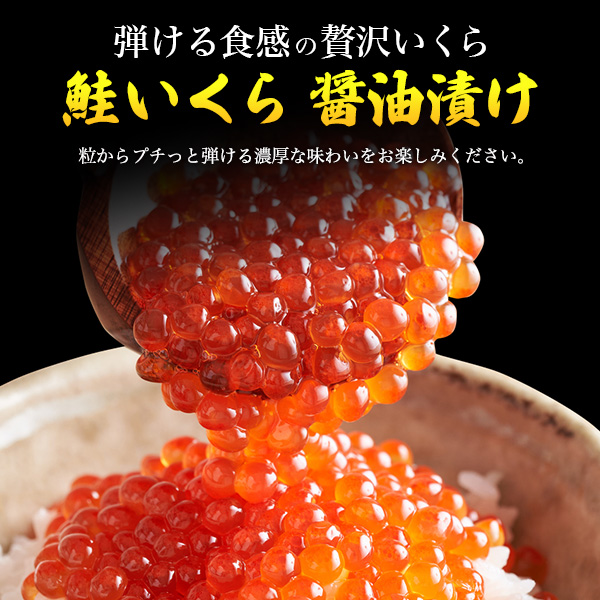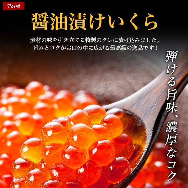 鮭卵(アメリカ産)、しょうゆ、オリゴ糖、粉末水あめ、水あめ、植物たん白加水分解物、米発酵調味料、昆布エキス、食塩、みりん、酵母エキス/調味料(アミノ酸等)※一部にいくら・小麦・大豆を含む