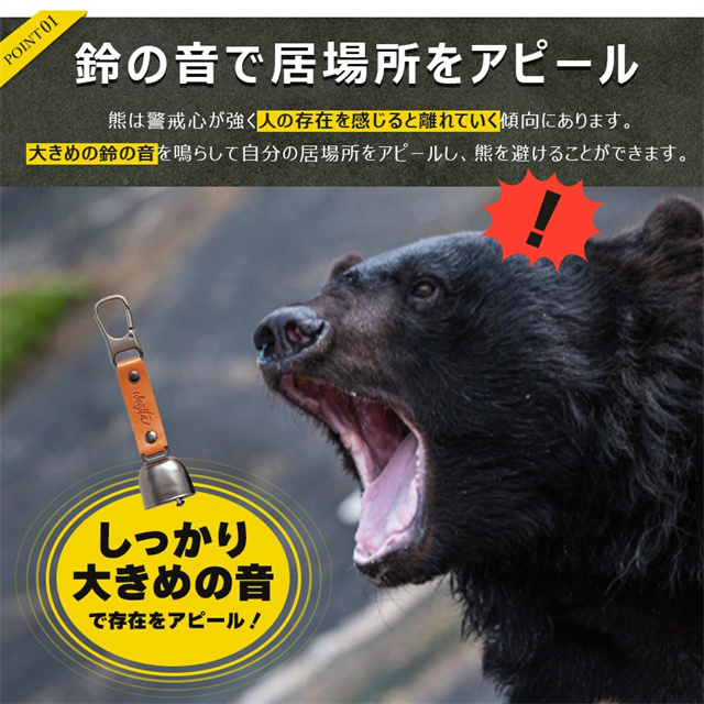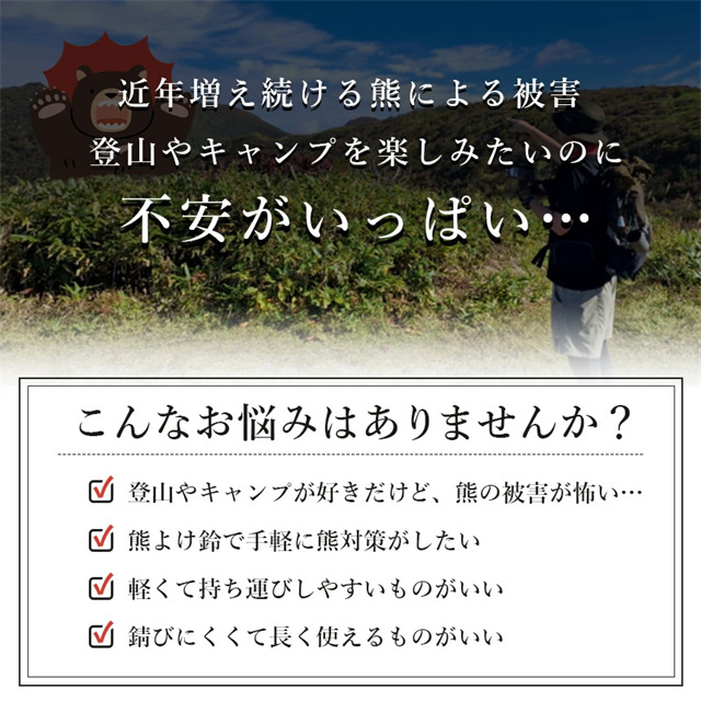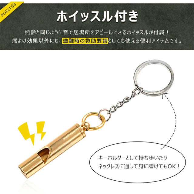 | 特徴 | ◎音で居場所をアピール!熊よけ鈴&笛◎ 近年増加している熊による様々な被害… キャンプや登山を楽しみたいのに熊が怖くて不安… 住んでいる地域が山に近くて熊が下りて来ないか心配… そんなお悩みはありませんか? さらには最近寒くなってきて熊も冬眠するし大丈夫! と思われがちですが、近年の熊は冬眠時期が遅れたり、中には冬眠しない熊も増えてきています。 そんな時におすすめの熊対策用の鈴&ホイッスルのセットです。 熊は警戒心が強く人の気配を感じると離れていく傾向にあります。 この熊よけ鈴、笛で大きめの音を鳴らして自分の居場所をアピールし、熊を避けることができます。 【消音機能付き】 磁石で鈴をとめるだけの簡単ワンステップ消音。 室内や移動時など、あまり音を鳴らしたくない時に手軽に音を響かせないようにすることができます。 【ホイッスル付き】 鈴1つにつきホイッスルが1つ付属しています。 熊よけ以外にも緊急時に鳴らして助けを呼ぶ用途としても使用できる便利アイテムです。 【カラビナ付き】 カラビナ付きなのでストラップとしてバッグにつけたり、テントに吊り下げたりなど様々な場所でお使いいただけます。 |