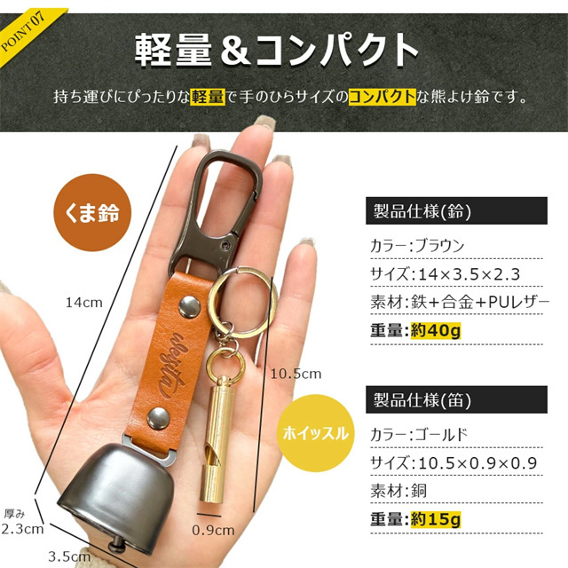 | 仕様 | 〇鈴 ・サイズ 全長約14×3.5×2.3cm ・素材 鉄+合金+PUレザー ・重量 約40g 〇笛 ・サイズ キーリングまで含む長さ10.5cm 笛本体の直径0.9cm ・素材 銅 ・重量 約15g(キーリングまでを含む) |