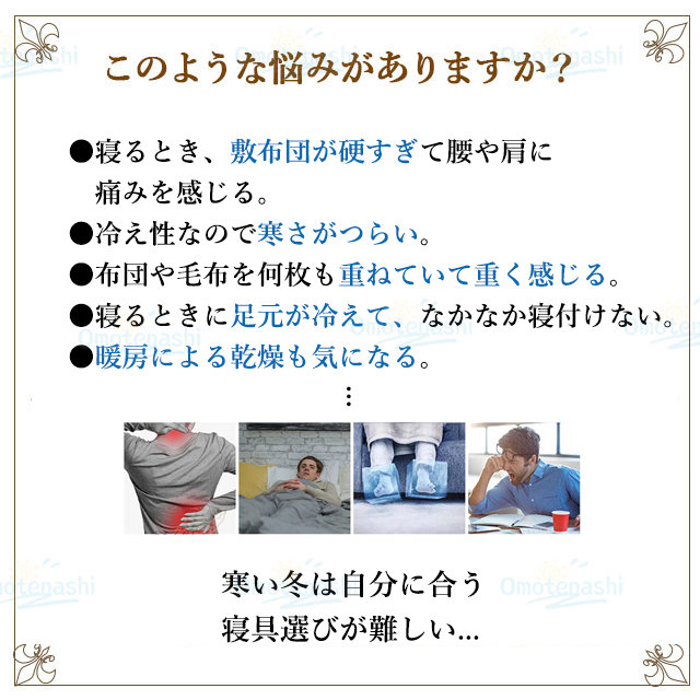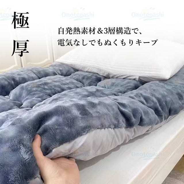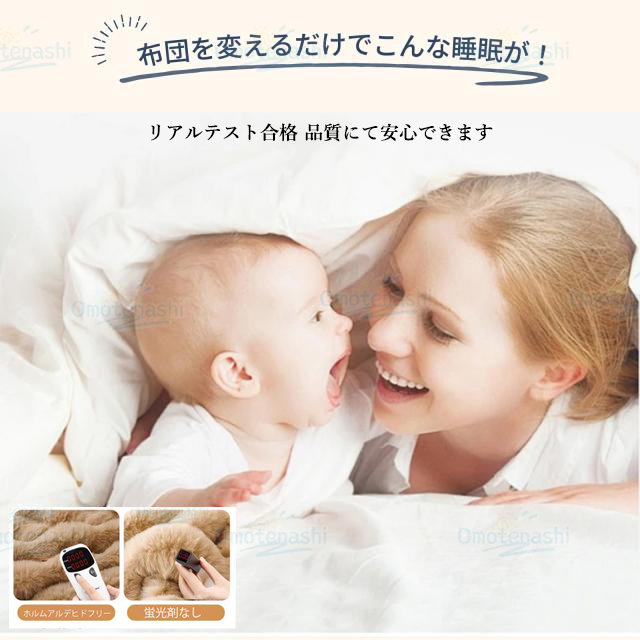 - ふわふわで寝心地が良くとても暖かいです。思ってたよりも厚みがあり、寝心地がいいようで、朝起きれないと話してました。早い発送ありがとうございます。