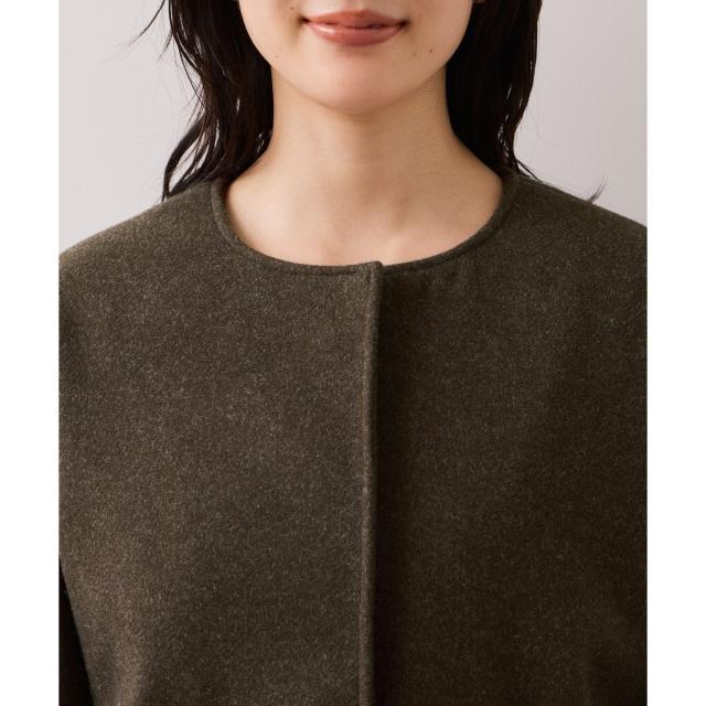 ノーカラー仕様で首まわりがすっきり見え、タートルやストールとのバランスも取りやすい一枚です。ドロップショルダー×ゆるめの身幅で、綺麗めながらも抜け感のあるリラックスシルエット。前立てはミニマルな比翼仕立てになっており、甘さを抑えて大人っぽい印象に仕上げています。