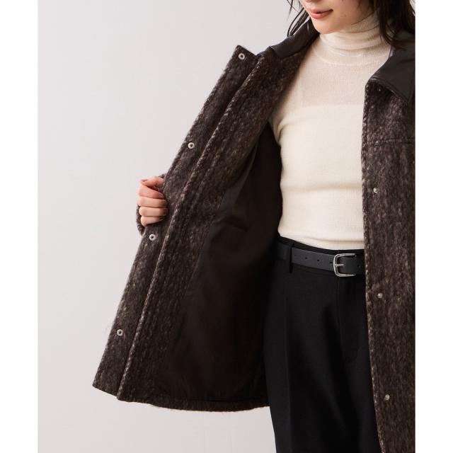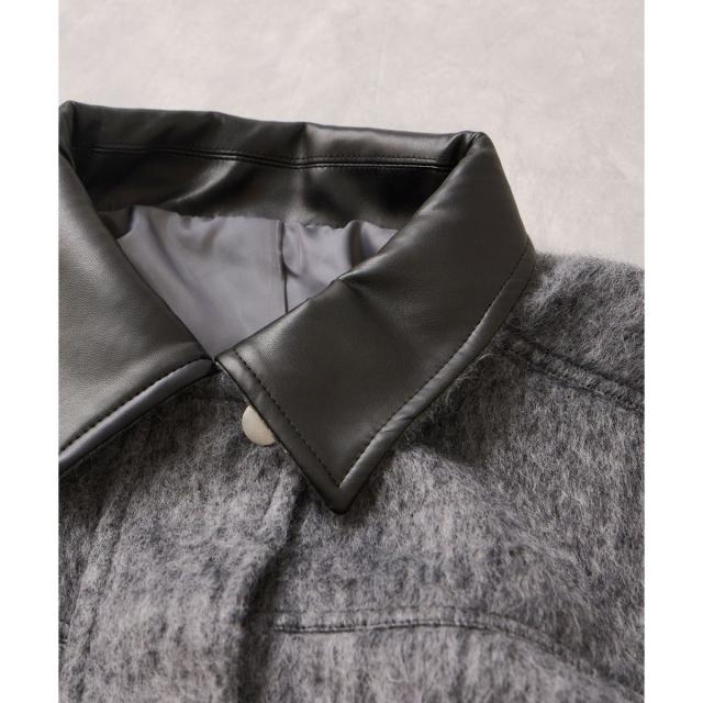 柔らかな素材感の中に、レザーの上品なアクセントが加わり、羽織るだけで女性らしいメリハリと華やかさが生まれます。ゆとりのあるシルエットで冬の厚手ニットの上からも着やすく、スカートにもパンツにも合わせやすい万能バランスに仕上がっています。フェイクレザーの襟が顔まわりをすっきりと見せ、カジュアルな着こなしにも品を添えてくれるのも魅力。デイリーからお出かけスタイルまで幅広く使える、大人フェミニンな印象の一枚です。