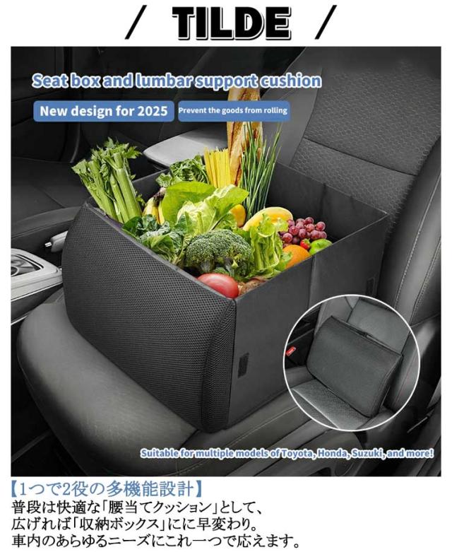 | 1つで2役の多機能設計!折りたたみシートボックス。【蓋付き】 【1つで2役の多機能設計】 普段は快適な「腰当てクッション」として、広げれば「収納ボックス」にに早変わり。車内のあらゆるニーズにこれ一つで応えます。 【買い物の荷崩れを徹底ガード】 助手席や後部座席に置いた買い物袋やバッグが、ブレーキやカーブで倒れて中身が散乱…そんなお悩みを解決!ボックス型にすれば、大切な荷物をしっかりホールドし、運転に集中できます。 【散らかる小物をスマートに収納】 車内に置きがちな上着やブランケット、仕事の書類などをまとめて収納。散らかりやすい空間をスッキリ整頓し、快適なドライブをサポートします。 【腰を支えるドライブパートナー】 クッションとして使用すれば、運転中の背中とシートの隙間を埋め、腰にかかる負担を優しくサポート。長時間のドライブや日々の通勤をより快適にします。 【使わない時も邪魔にならない】 荷物入れとして使わない時は、たたんで腰当てクッションとしてシートに置いておけるので、収納場所に困りません。車内の景観を損なわない、スマートでシンプルなデザインです。 | |