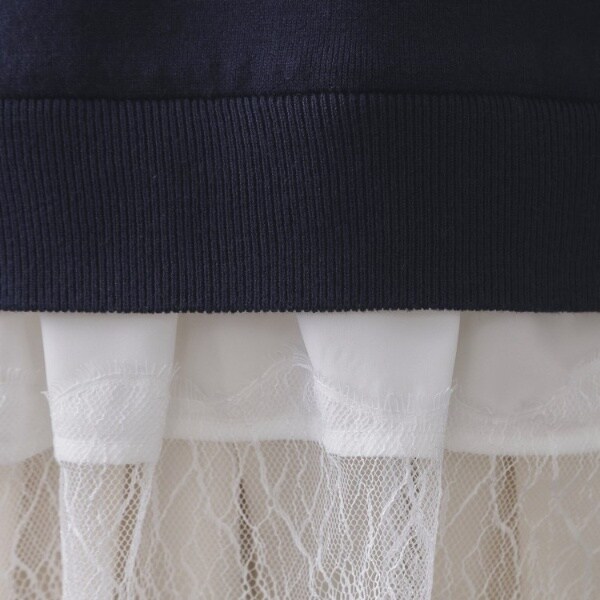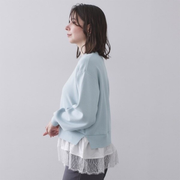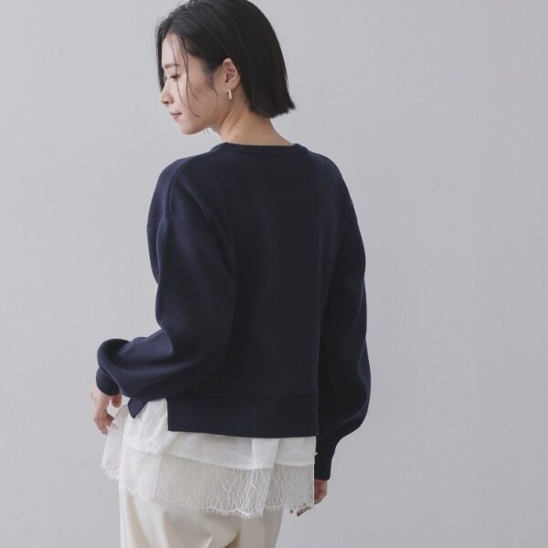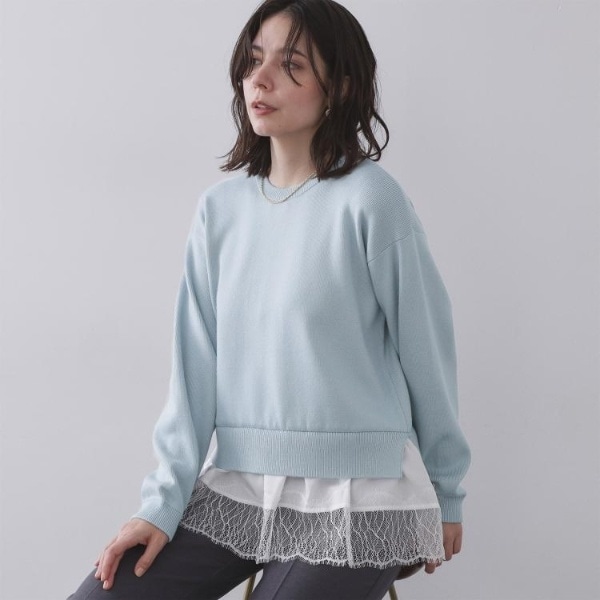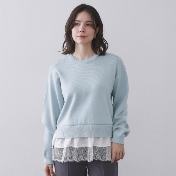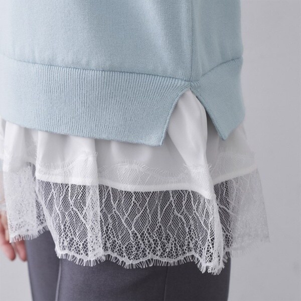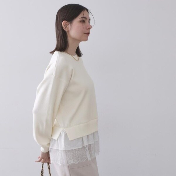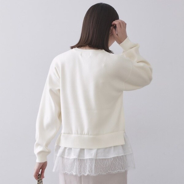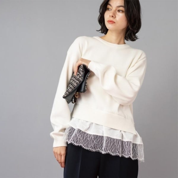 ・ニット地の身頃から、レイヤード風にレース素材をドッキングした華やかなニットプルオーバー。
