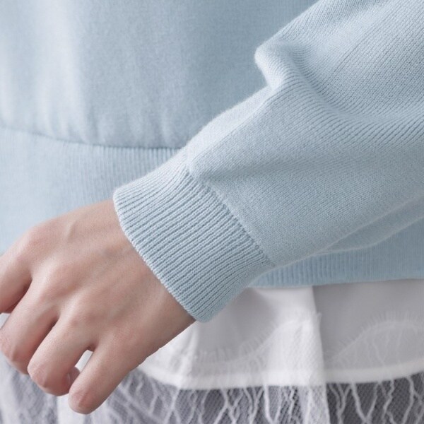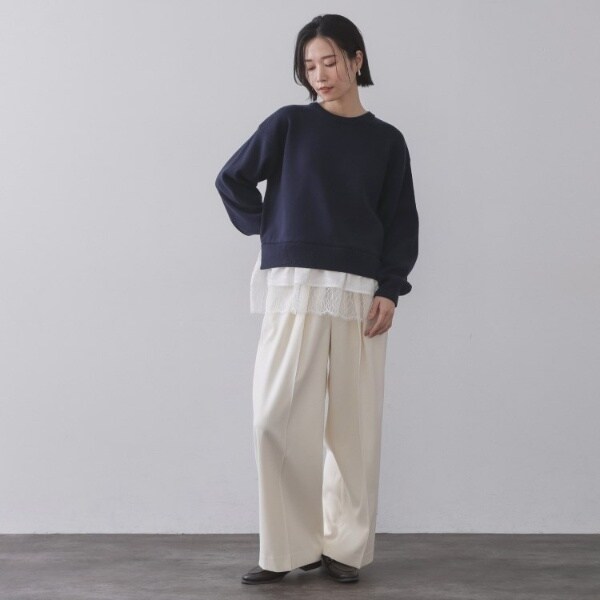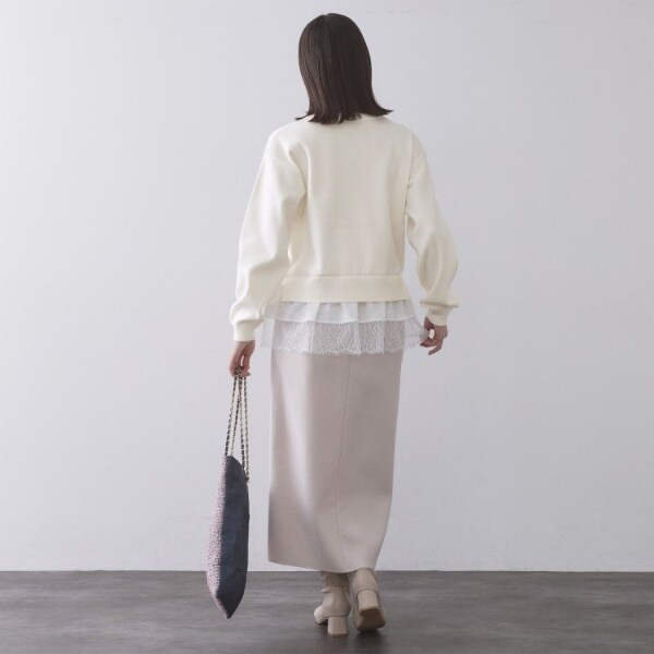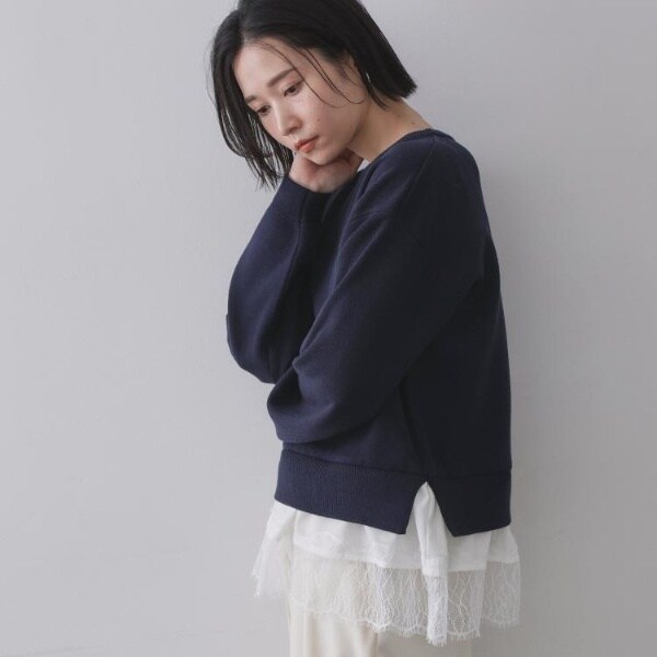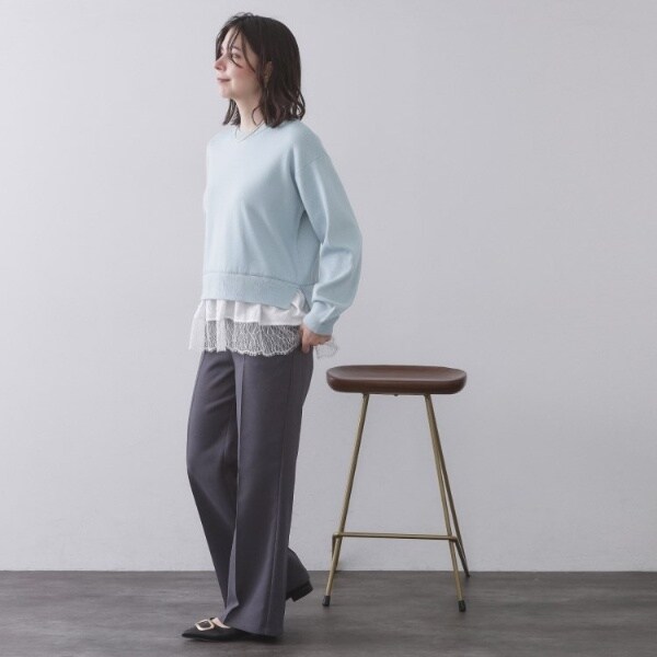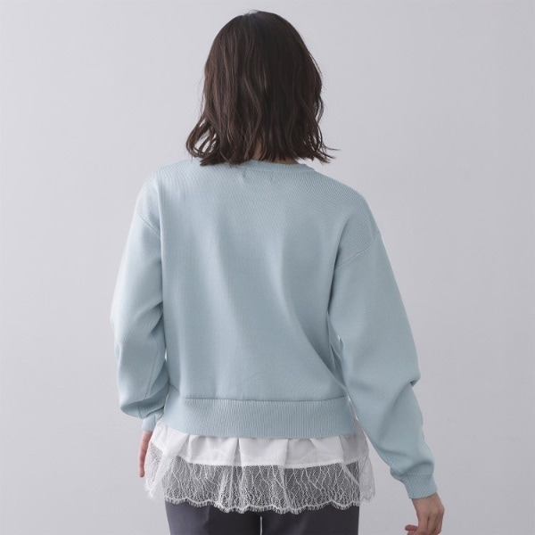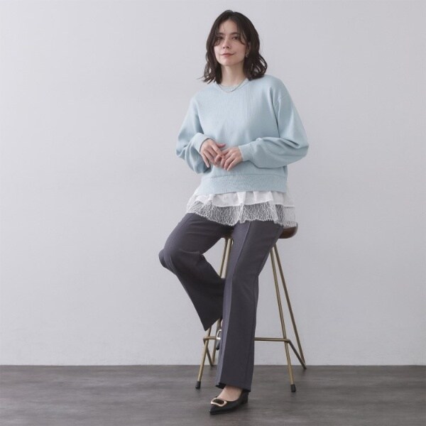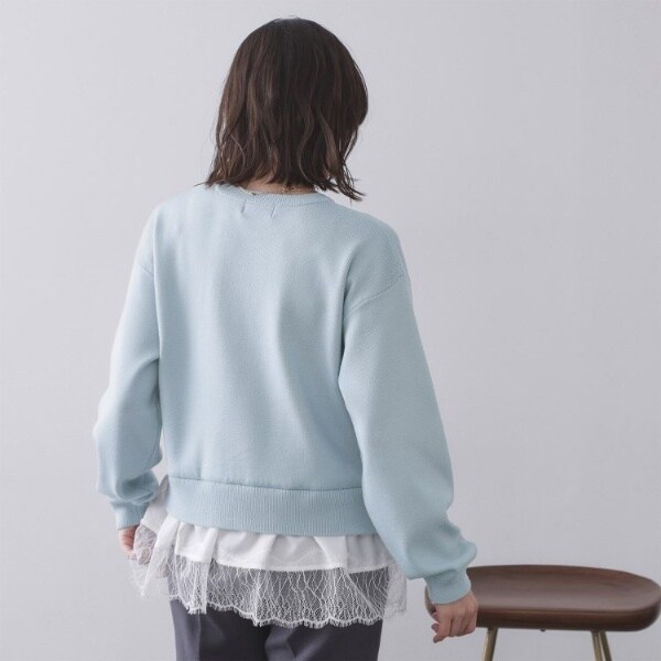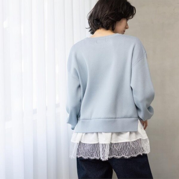 ・ニット地の身頃から、レイヤード風にレース素材をドッキングした華やかなニットプルオーバー。