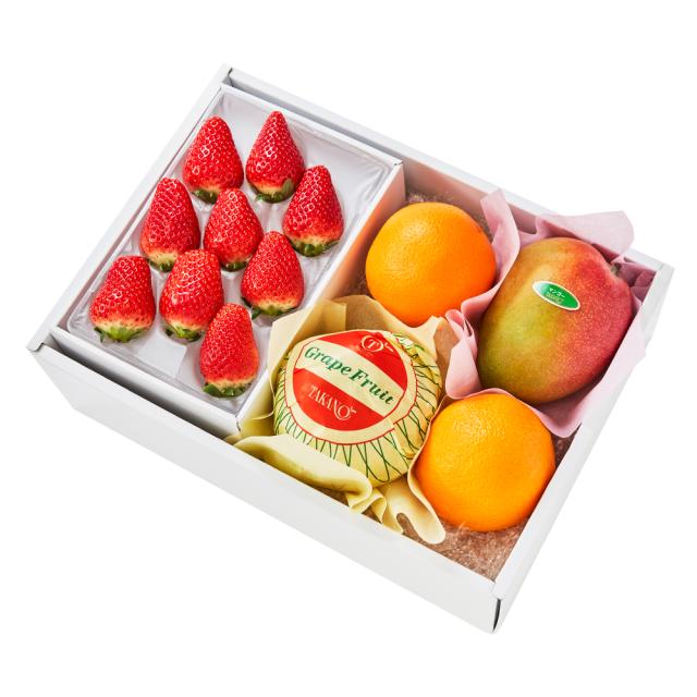 | 内容量 | 苺 9粒(静岡県、佐賀県、栃木県、熊本県、千葉県、長崎県、茨城県または福岡県産)×1、マンゴー(ブラジル、ペルーまたはオーストラリア産)、グレープフルーツ(アメリカ、メキシコまたはオーストラリア産)×各1、オレンジ(アメリカまたはオーストラリア産)×2 |