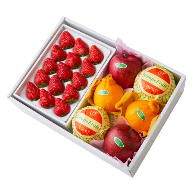 | 内容量 | 苺15粒(静岡県、佐賀県、栃木県、熊本県、千葉県、長崎県、茨城県または福岡県産)×1、グレープフルーツ(アメリカ、メキシコまたはオーストラリア産)、デコポン(熊本県または佐賀県産)、ふじ(青青森県、山形県、長野県または岩手県産)×各2 |