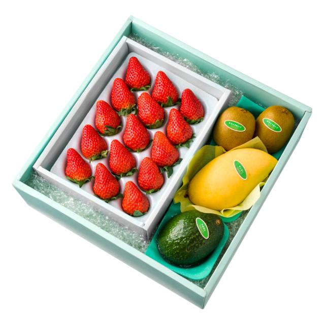 | 内容量 | 苺 15粒(静岡県、佐賀県、栃木県、熊本県、千葉県、長崎県、茨城県または福岡県産)×1、タイマンゴー(タイ産)、アボカド(メキシコまたはチリ産)×各1、キウイフルーツ(ニュージーランド、愛媛県、和歌山県、山梨県または福岡県)×2 |