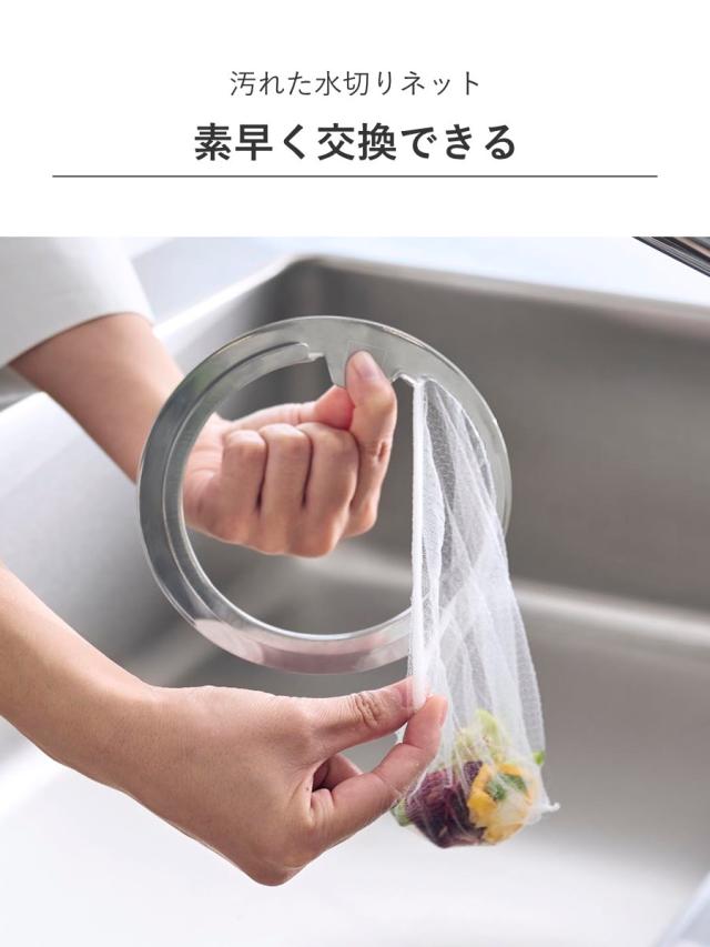 汚れた水切りネットになるべく触れずに交換できる排水口ネットホルダーです。排水カゴがないシンプル構造なので毎日のお手入れがラクになります。調理に出たゴミを捨てる時はネットを交換するだけなので排水カゴの掃除が不要になりシンクを清潔に使えます。
