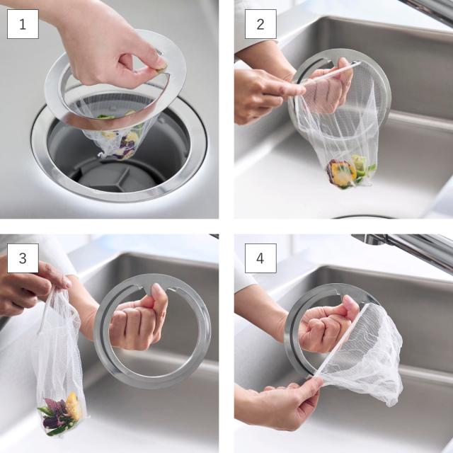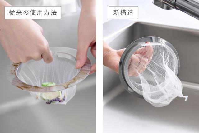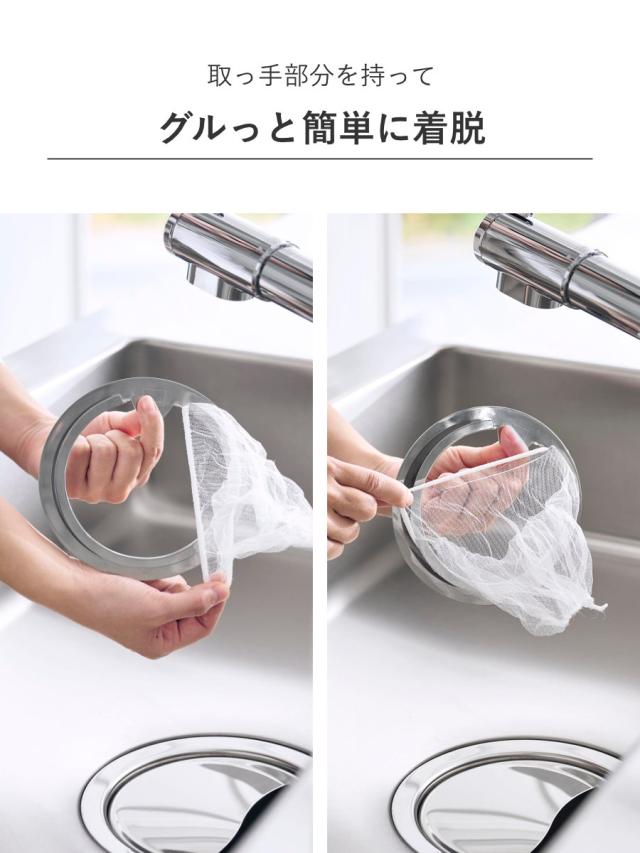 水切りネットを上から全体に被せるタイプのホルダーはネットの交換の際に両手で何度も触らなければならず、不快な作業。 | 排水口ホルダーの裏側にぐるりと、水切りネットを取り付けます、取っ手とネットの端だけを持って着脱できるので衛生的。 |
