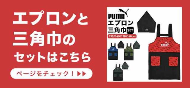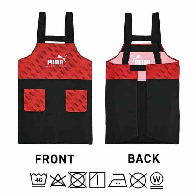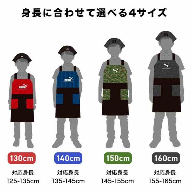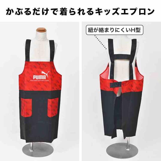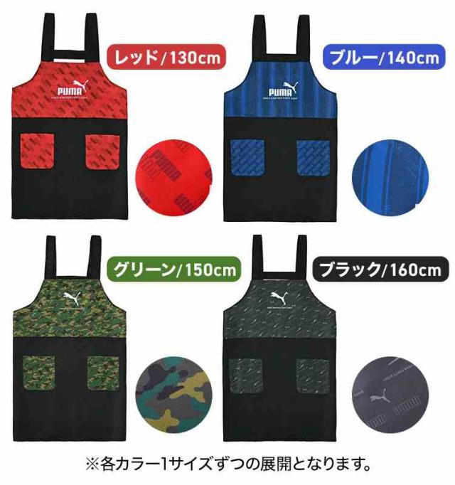 エプロン キッズ PUMA プーマ 男の子 小学生 子供 かぶるだけ 130 140 150 160 cm ポケット たくさん ポリエステル100% 洗える シンプル スポーツ ブランド 入学 準備 小学校 中学校 中学生 ジュニア 家庭科 調理実習 給食 黒 ブラック 赤 レッド 青 ブルー カーキ 迷彩 緑
