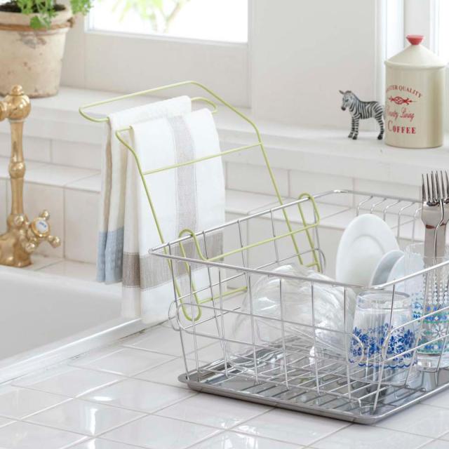 今お使いの水切りカゴに引っ掛けるだけで使える外付けタイプの布巾ハンガーです。食器拭きや台拭きの布巾を干すのに場所を取らずに便利です。