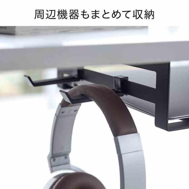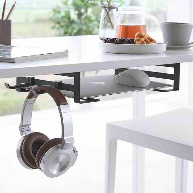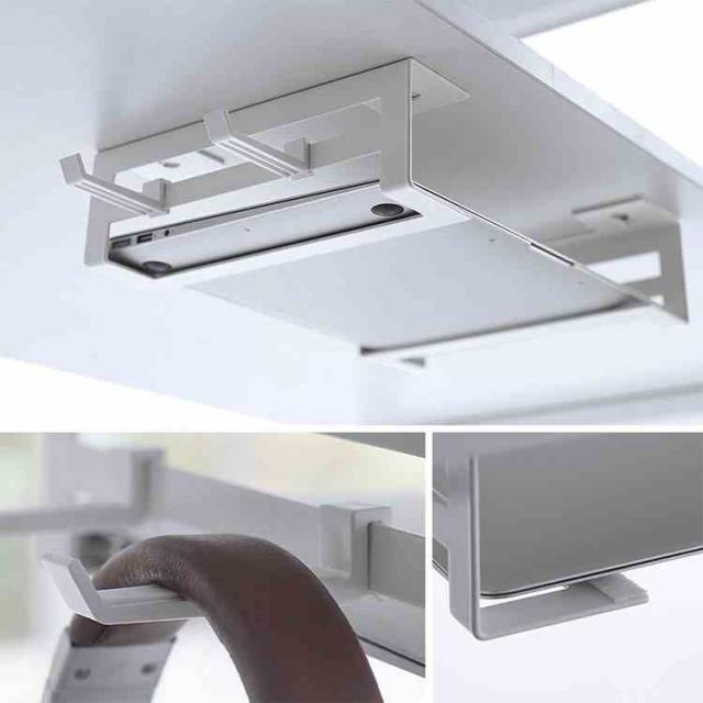 ノートパソコンや周辺機器をデスク下に一括収納できるラックです。置き場所に困るノートパソコンをスッキリ収納可能。収納物をキズから守るフェルト付きで、奥のガイドが落下を防ぎます。側面があいているのでケーブル類に干渉せず、快適に使用できます。さらに、ヘッドセットや長いケーブル、デスクまわりの小物などを収納できる便利なフック2個付きです。