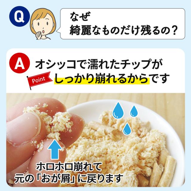 おしっこで崩れるタイプです。水分の吸収で原料である木の粉 おが粉 に戻ります。