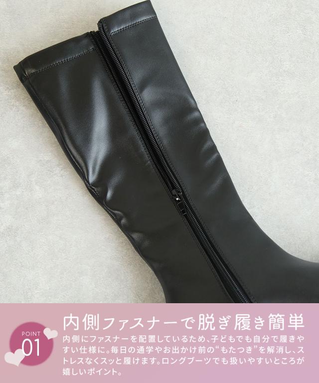 内側にファスナーを配置しているため、子どもでも自分で履きやすい仕様に。毎日の通学やお出かけ前の“もたつき”を解消し、ストレスなくスッと履けます。ロングブーツでも扱いやすいところが嬉しいポイント。