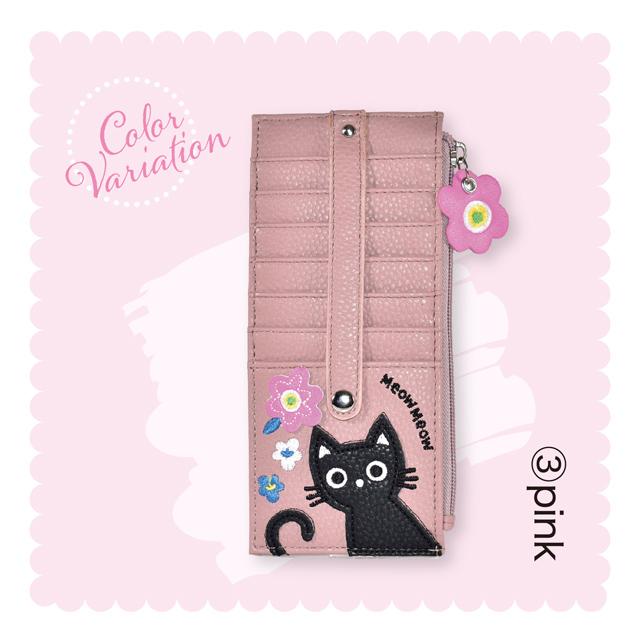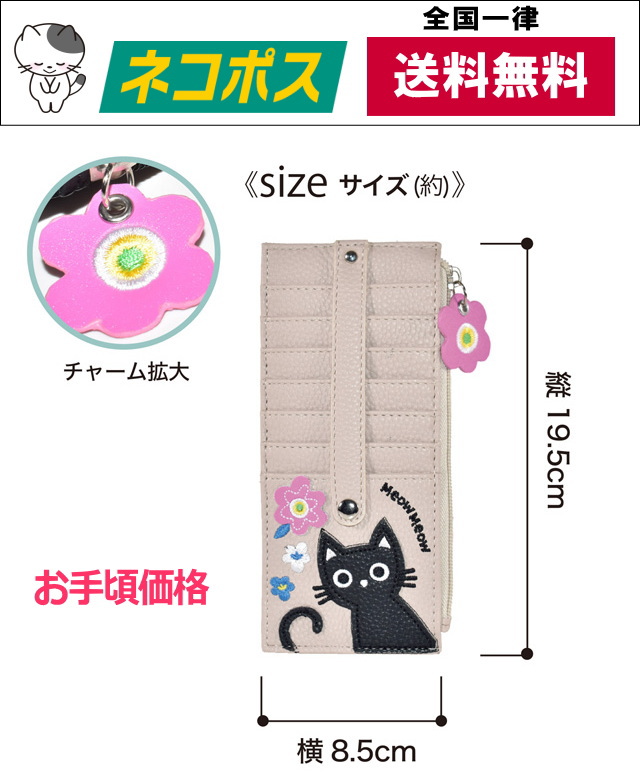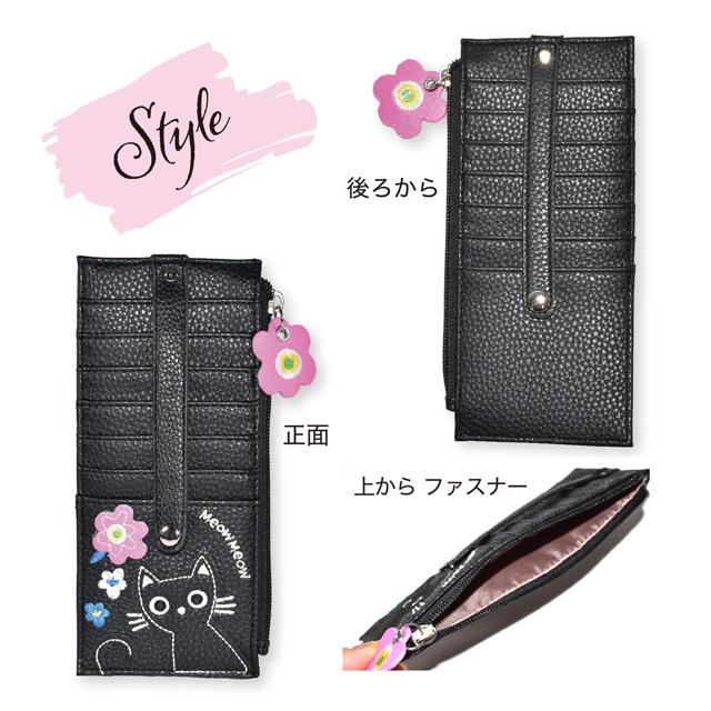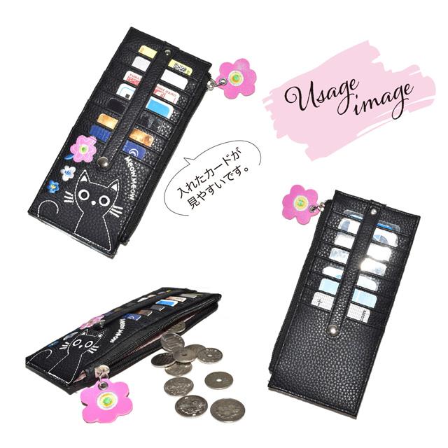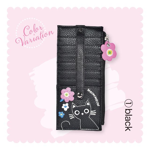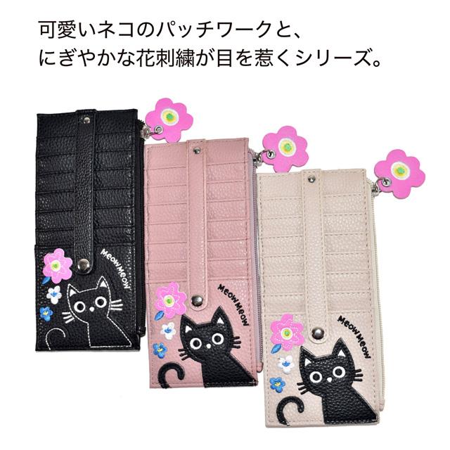 カードケース 猫 花 アップリケ 刺しゅう モチーフ スリム 薄型 クレジットカードケース レディース 小銭入れ 財布 大容量 両面 合皮 ブラック ベージュ ピンク かわいい おしゃれ 女性 ギフト プレゼント ネコグッズ 猫雑貨 猫好き【 誕生日 】