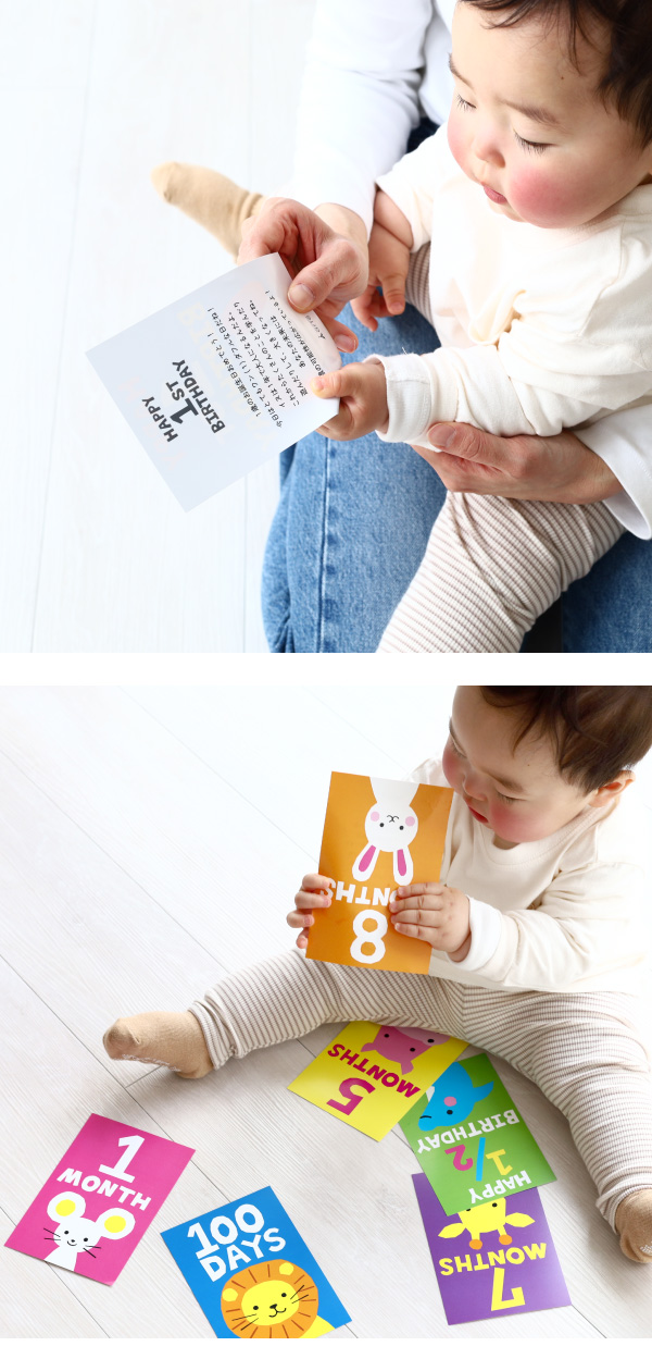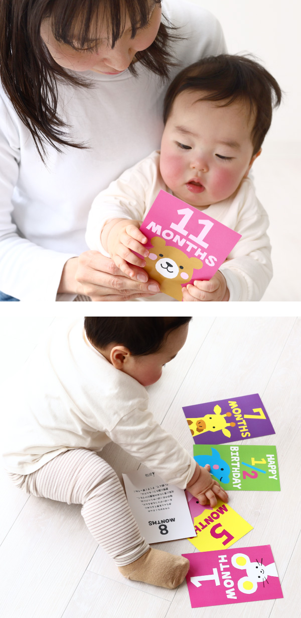 | セット内容 | ・just born・1month・2months ・3months・100days・4months・5months ・1/2 birthday ・7months・8months ・9months・10months・11months・1st birthday ・説明書カード |