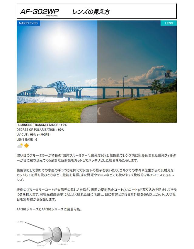 WPは[ワイドプロテクト]を意味します。AF-302WPは女性に似合うように最適化されたレンズサイズですが、適度に上下左右に幅広く、紫外線や風などから目を護ります。