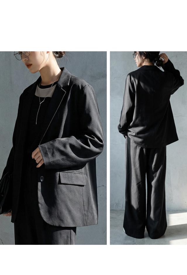 端正なテーラードカラーが顔まわりをきれいめに整え、前開きのシングル仕様とフロントボタンが上品な高級感を添えます。