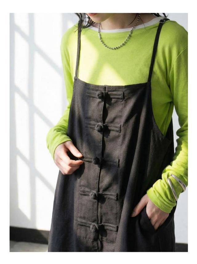 フロントに施したチャイナボタンがアクセントになり、シンプルながら個性ある柄のような存在感を放ちます。