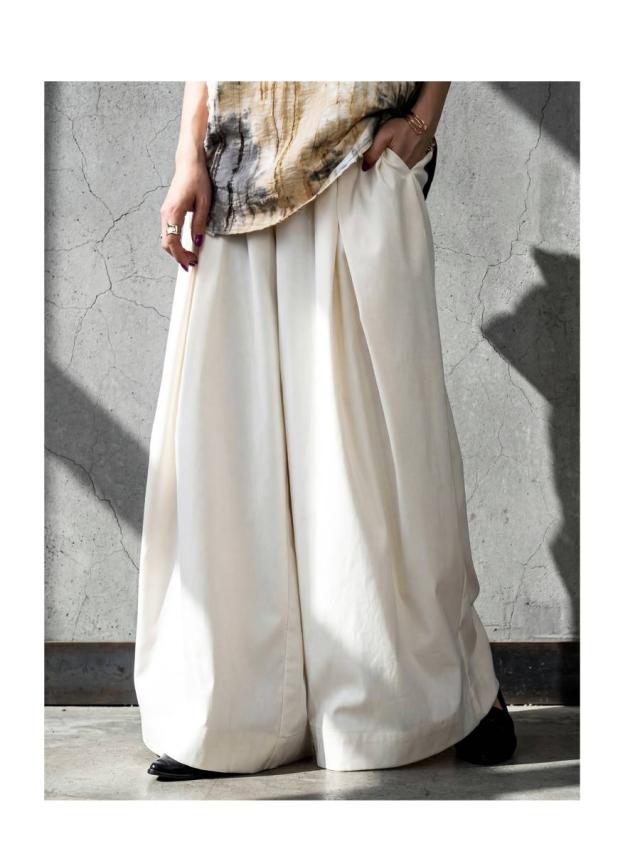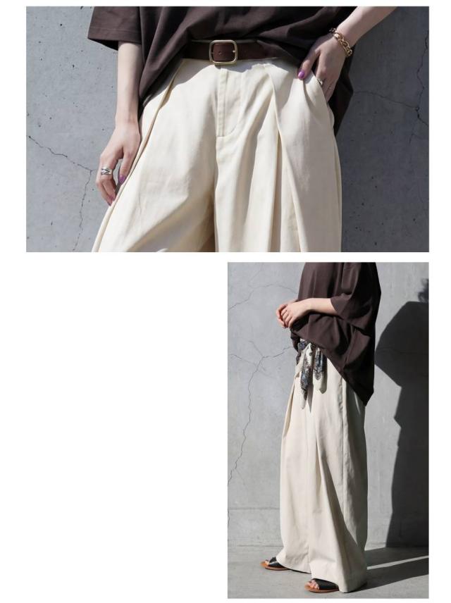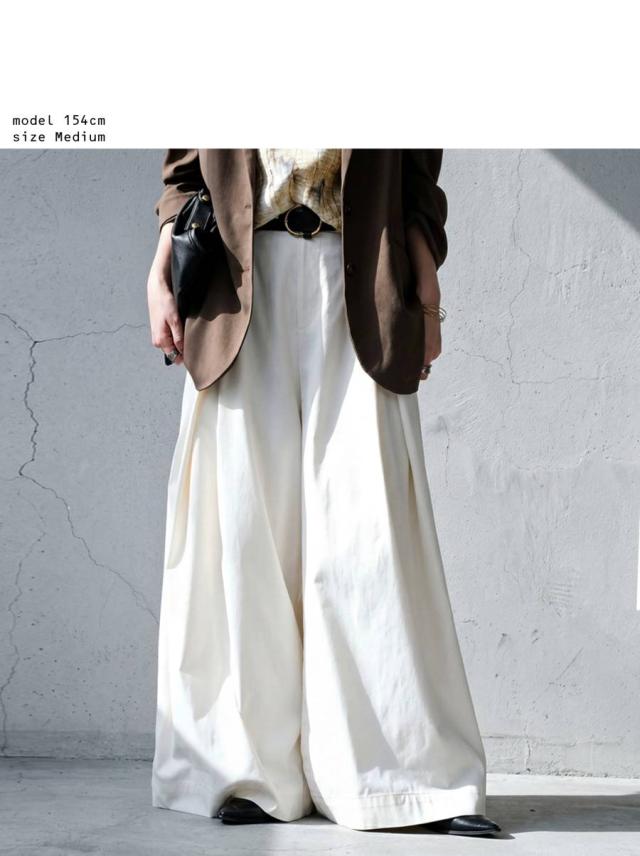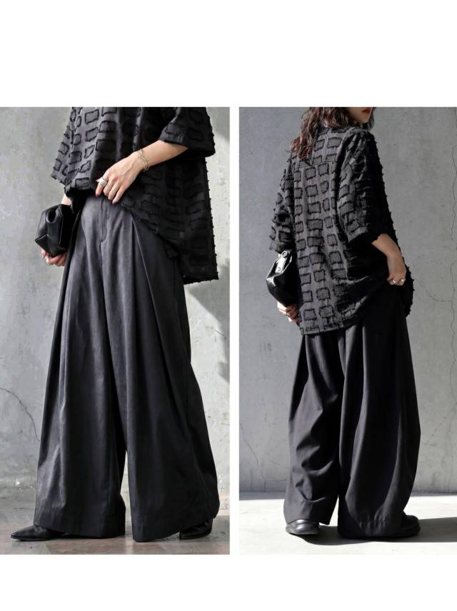 落ち感のあるなめらかな素材が魅力のタック入りワイドパンツです。