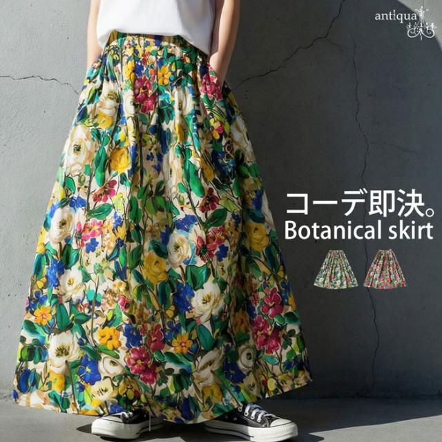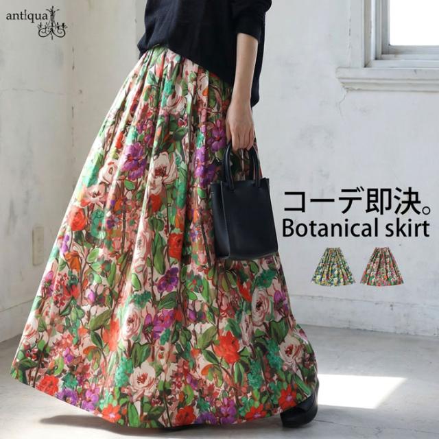 たっぷりと描かれた総花柄が目を惹く、存在感のあるロングスカートです。