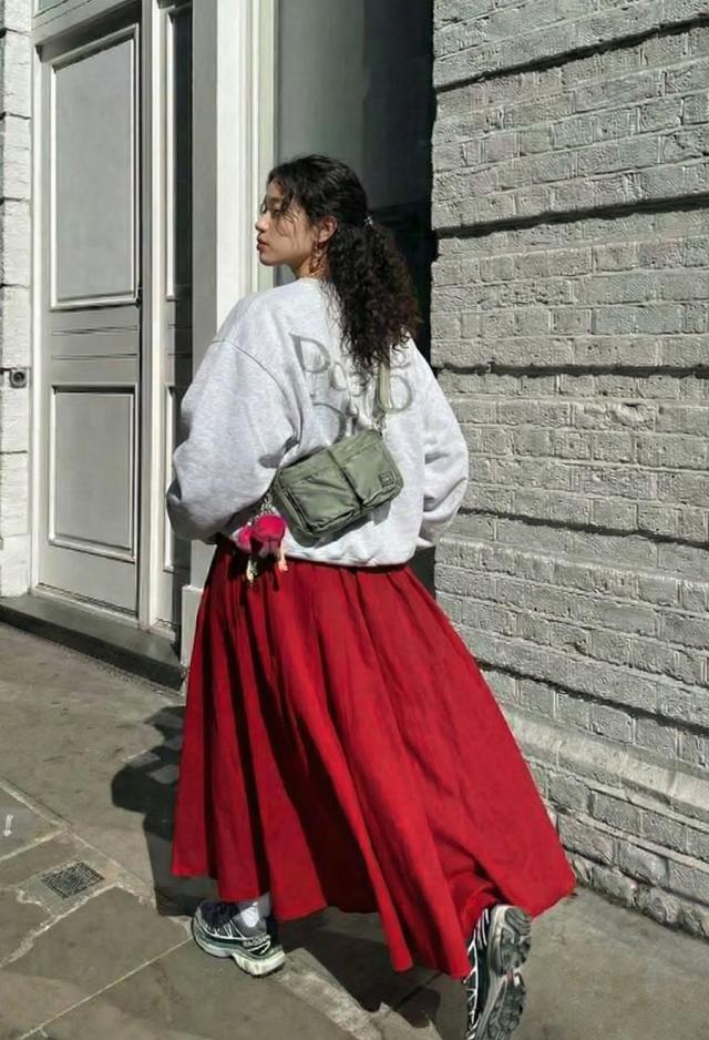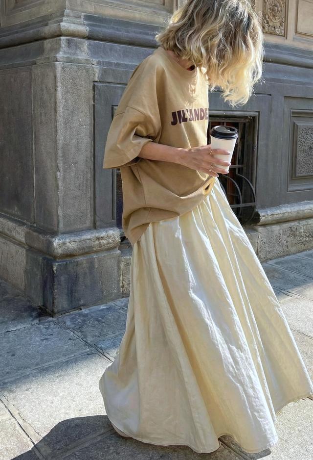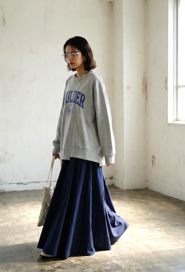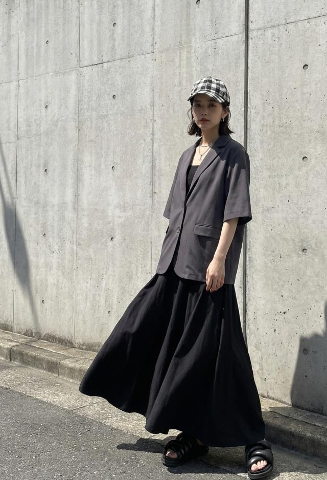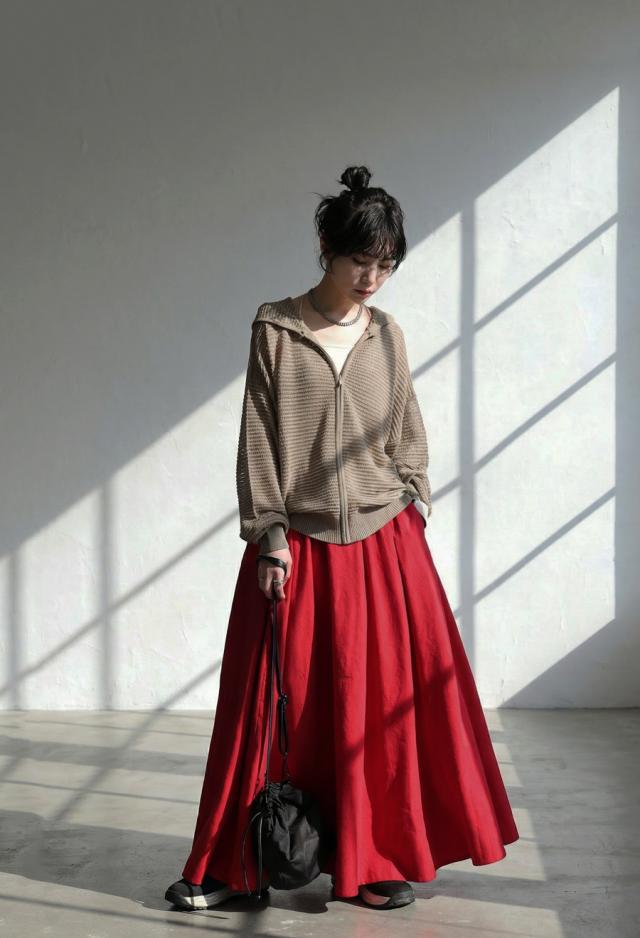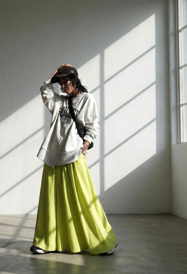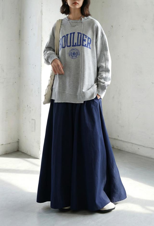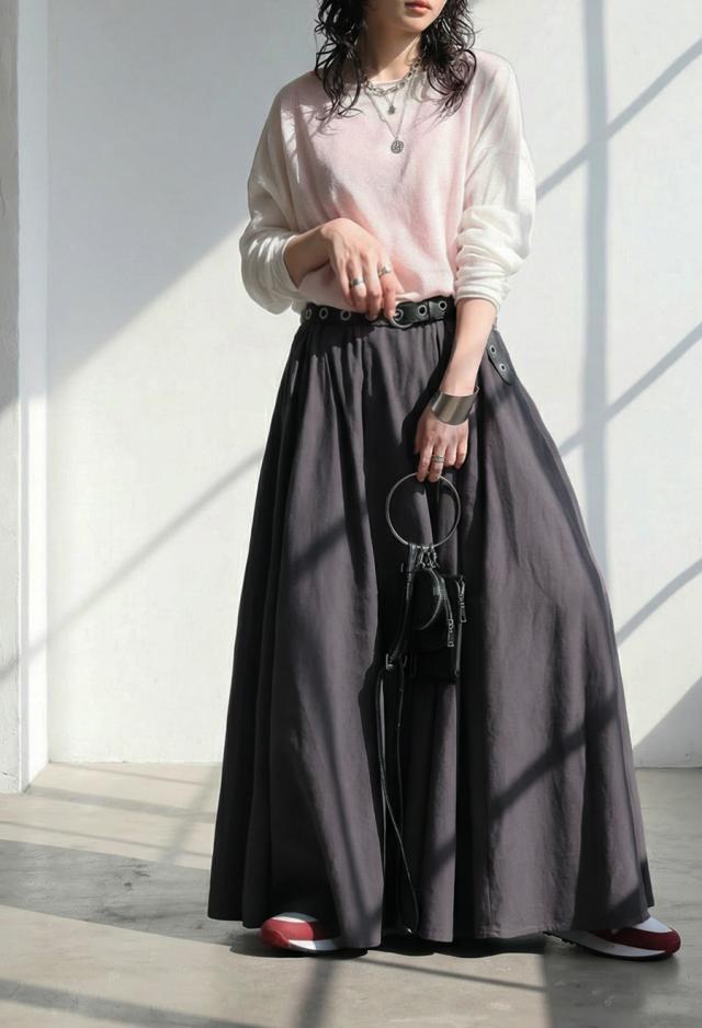 丈感は足首まで届くマキシ丈で、動くたびに揺れるシルエットが体型カバーを後押しします。