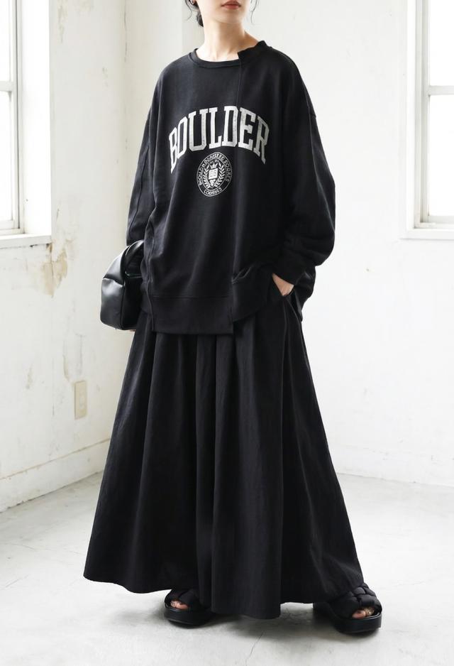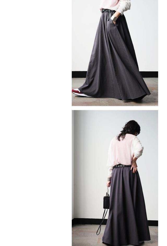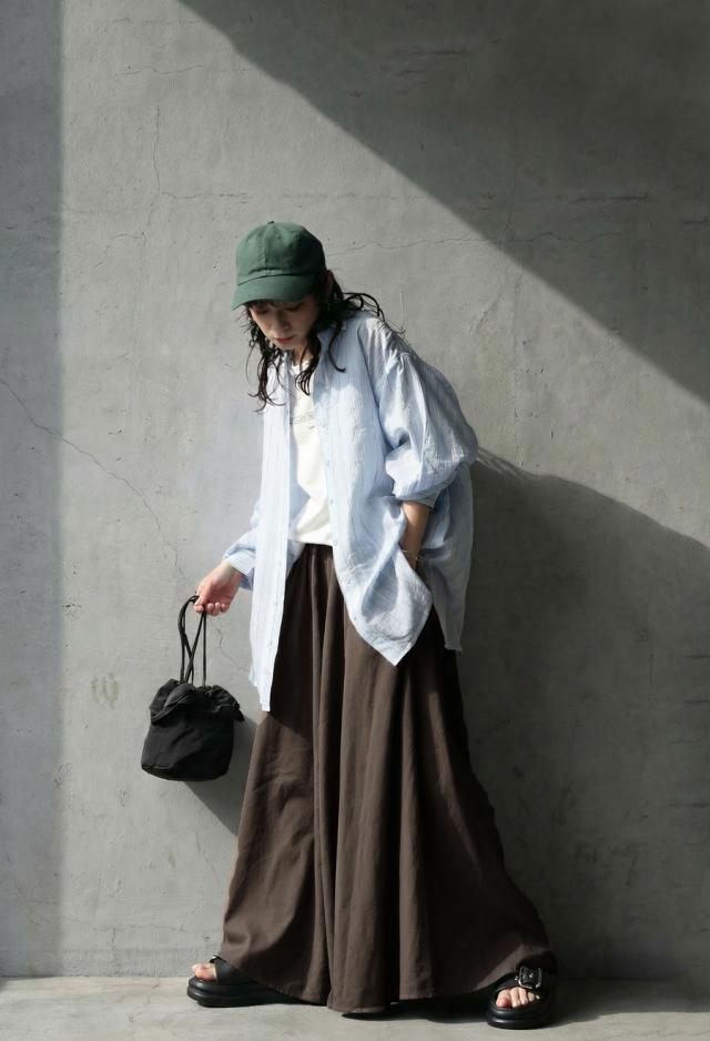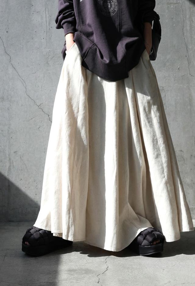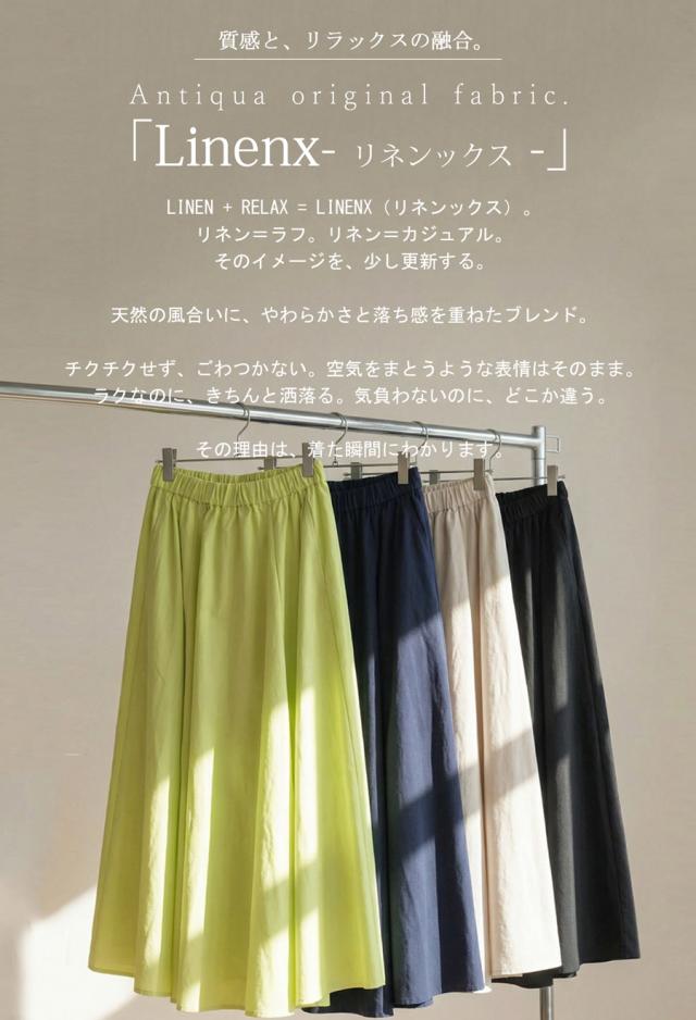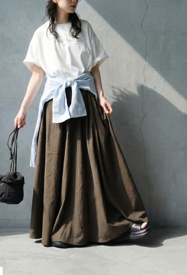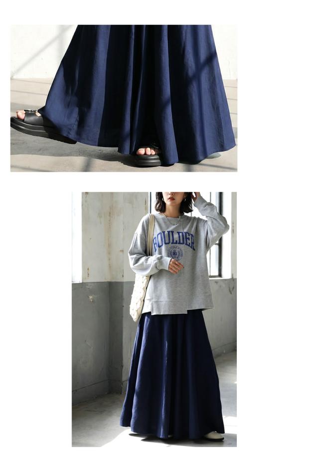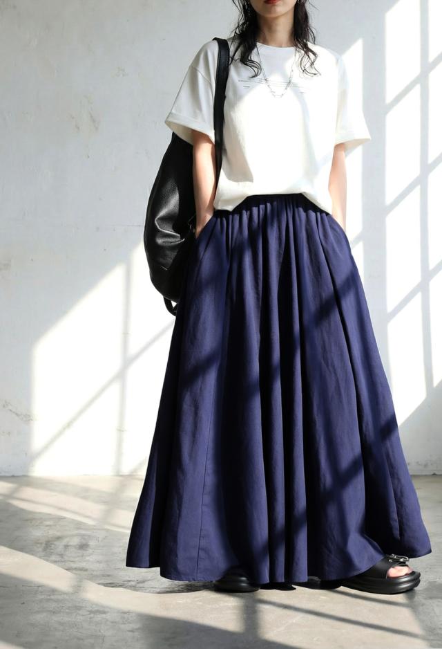 生地をたっぷりと使用し、美しく広がるAラインシルエットが印象的なリネン混素材のロングスカートです。