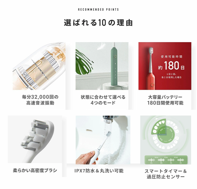 磁気浮上式モーター採用で歯垢をしっかり除去。音波水流が歯間・歯ぐきの汚れを優しくクリーン。デュポン社製極細毛が歯周ポケットまで到達。「W」型デザインで磨き残し防止。最大55dBの静音設計。