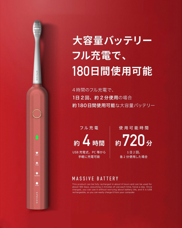 【連続使用時間】180日間(※1日2回、各2分間使用する場合)