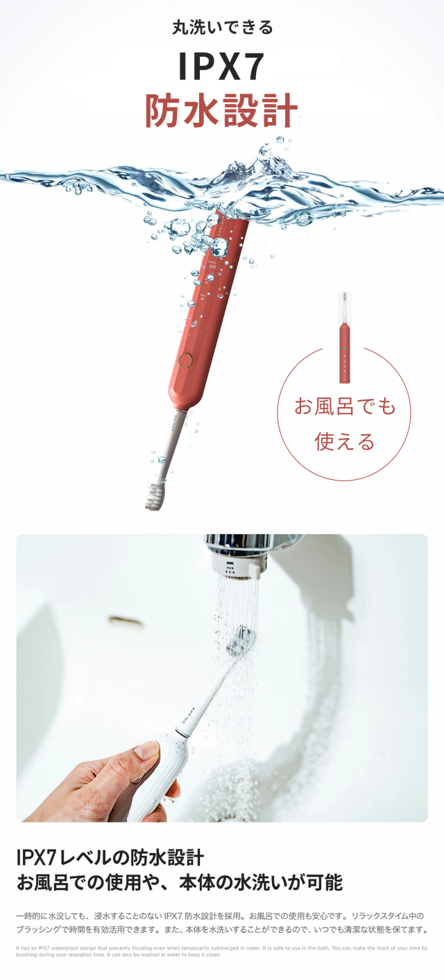 IPX7防水等級でシャワー中や浴室でも安心使用。本体全体水洗い可能。