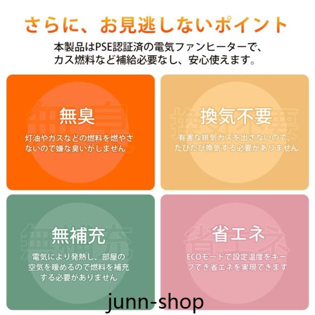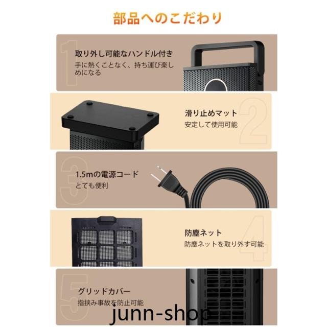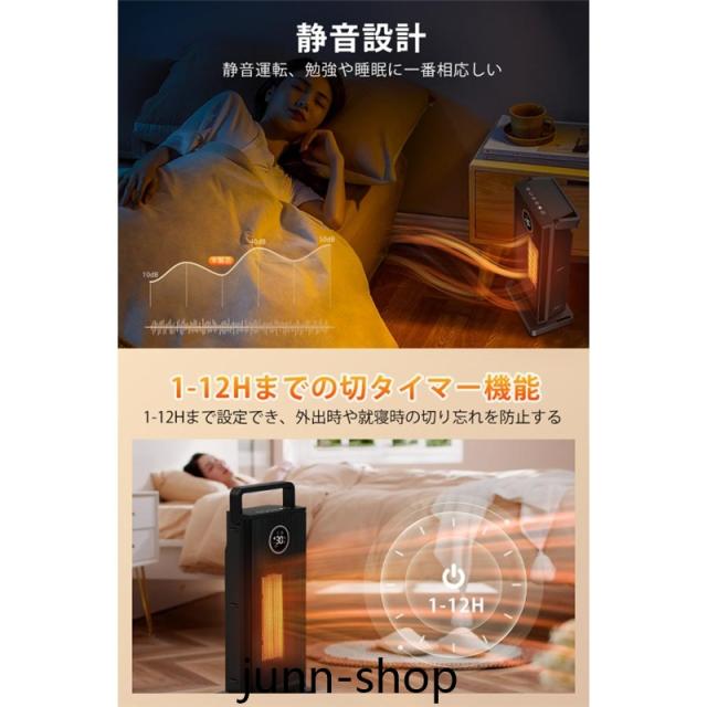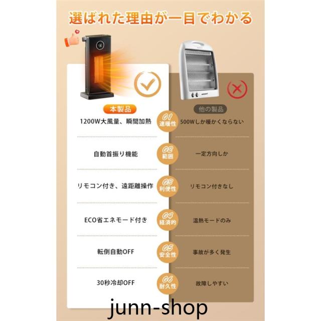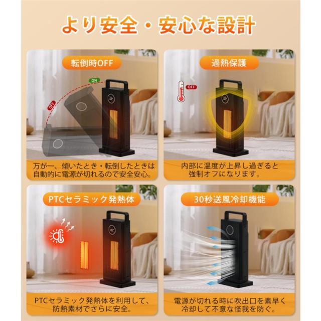 【安心安全】PSE認証済・過熱保護・転倒自動off機能付いています。過熱保護:ヒーター内部の温度が130℃を超えたら、自動が切れます、温度を降りました後、PTCセラミック発熱体が稼働続きことができます。転倒自動OFF:不意の衝撃や地震などでヒーターが倒れても自動で電源が切れるので、ベービーやペットがいる家庭でも安心にご使用頂けます。