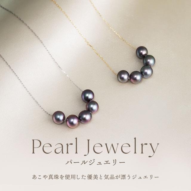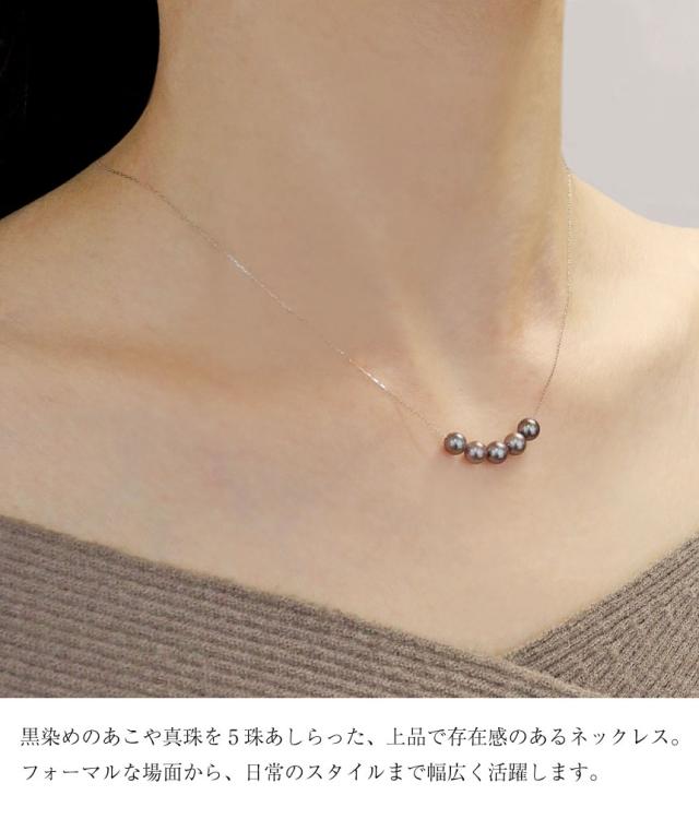 染め黒あこや真珠を5珠並べたスルーネックレスは、ラインを描き、大人の装いにモダンなアクセントを添えます。染め黒あこや真珠特有の深みある艶とPT900(プラチナ)またはK18YG(イエローゴールド)の上質な輝きが調和し、日常使いはもちろんフォーマルシーンでも存在感を放ちます。