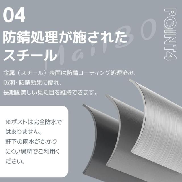 【防錆処理が施されたスチール】金属表面は防錆コーティング処理済み、防潮・防錆効果に優れ、長期間美しい見た目を維持できます。※ポストは完全防水ではありません。軒下の雨水がかかりにくい場所でご利用ください。