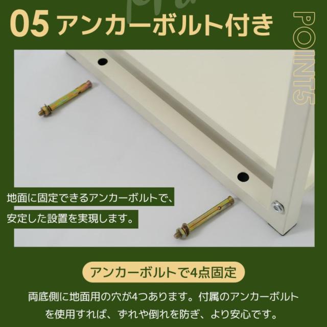 【アンカーボルト付き】地面に固定できるアンカーボルトで、安定した設置を実現します。アンカーボルトで4点固定両底側に地面用の穴が4つあります。付属のアンカーボルトを使用すれば、ずれや倒れを防ぎ、より安心です。