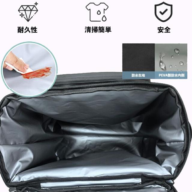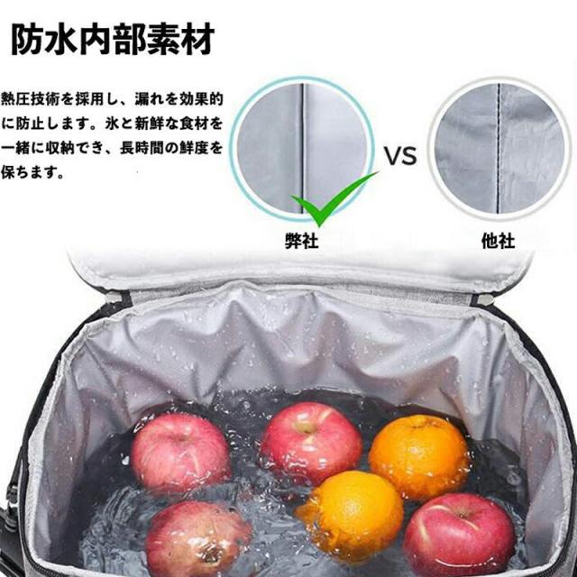 このクーラーバッグは**防漏水設計**を採用しており、高品質な熱圧技術を使用して製造されています。したがって、このバッグに氷や必要な食材を一緒に収納しても、食材がこぼれる心配はありません。食材を長時間新鮮な状態で保つことができます。この特徴は、防漏水バッグと同様の原理を応用しています。