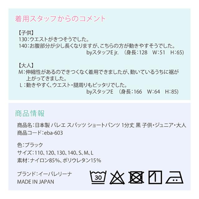 日本製 バレエ スパッツ ショートパンツ 1分丈 黒 子供 ジュニア 大人 イーバレリーナオリジナル バレエパンツ ショートレギンス インナーパンツ フィット ストレッチ 伸縮 花柄 レッスン 練習 着 ブラック 110 115 120 125 130 135 140 145 150 155 160 165 170