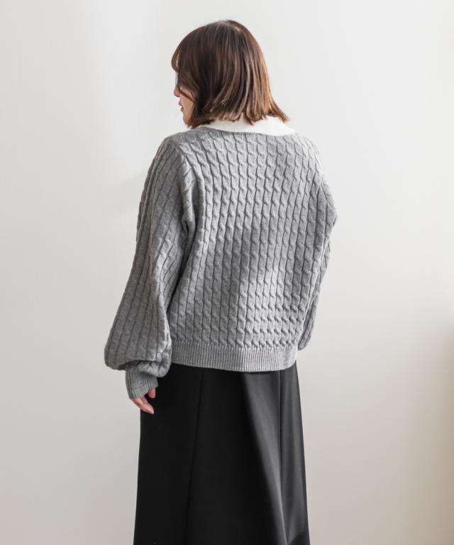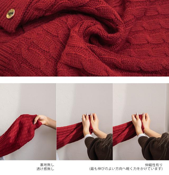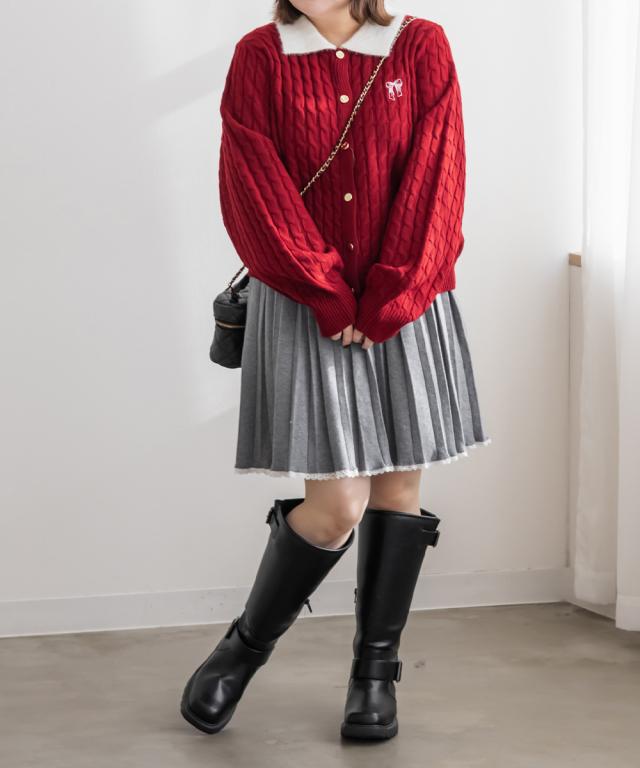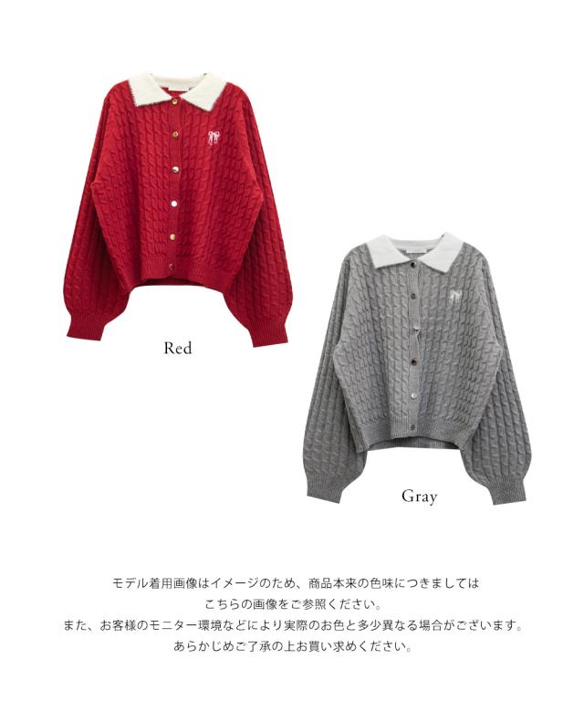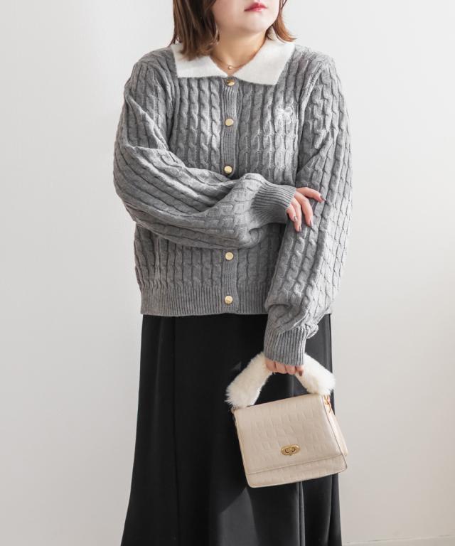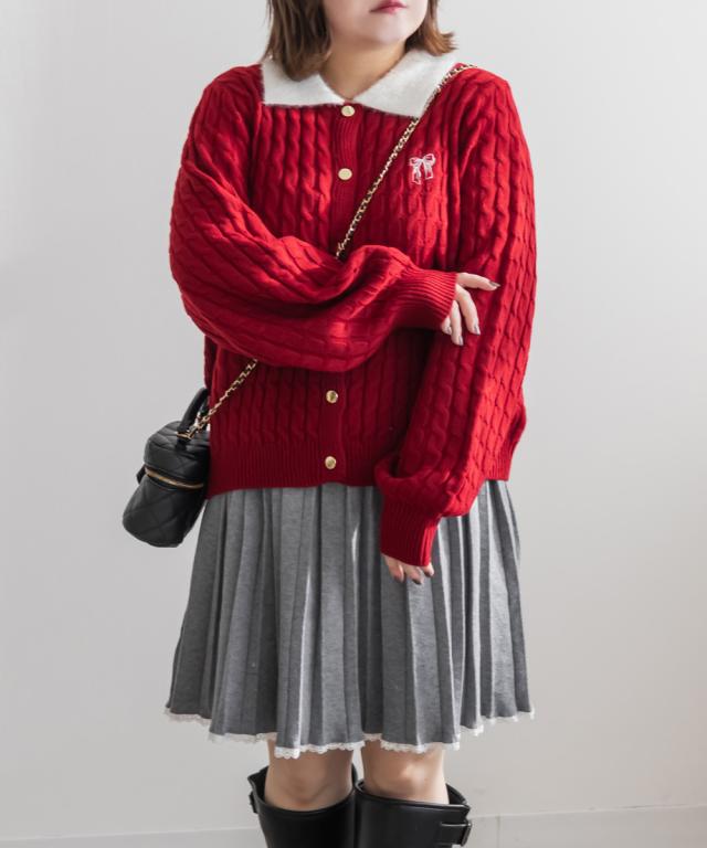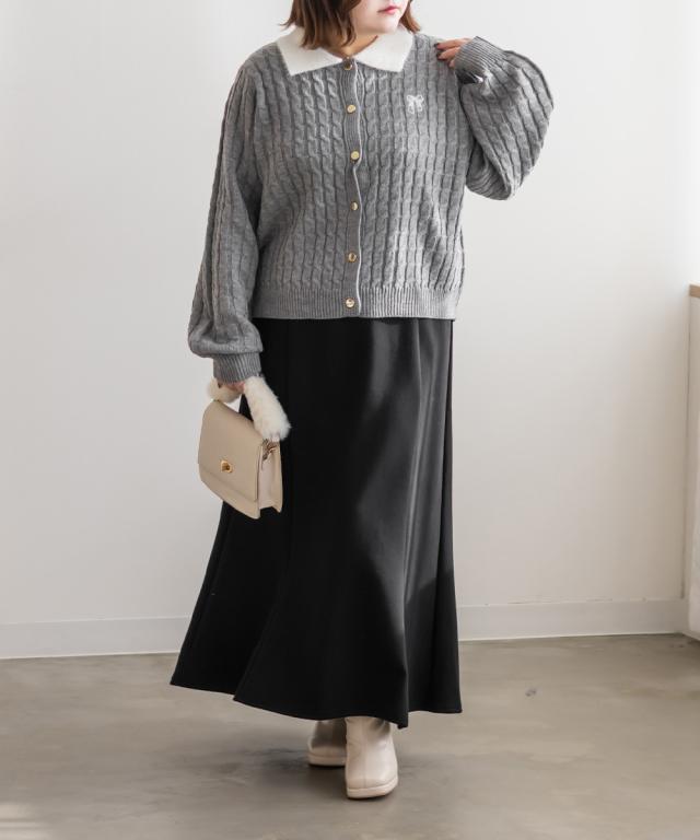 | 3Lサイズを着用しました。伸びのいいニットで楽に着られました。メリハリのあるケーブル編みで可愛いです◎ 襟付きデザインとゴールドボタンがトレンド感をプラスしてくれて、 ガーリーに着られるところがお気に入りです♪リボン刺繍のワンポイントも付いていてコーデのポイントになるアイテムです!これからの季節、デートやお出かけなどにおすすめです! |