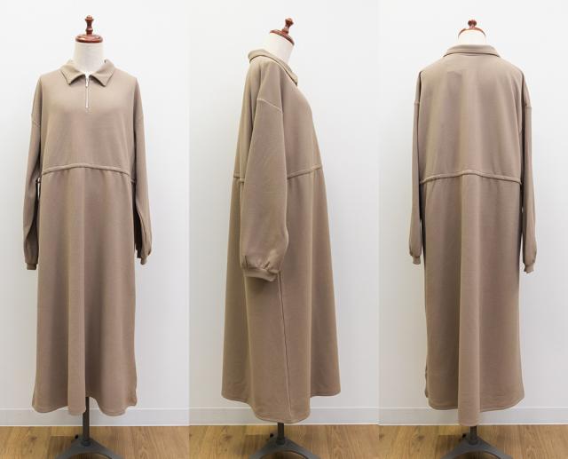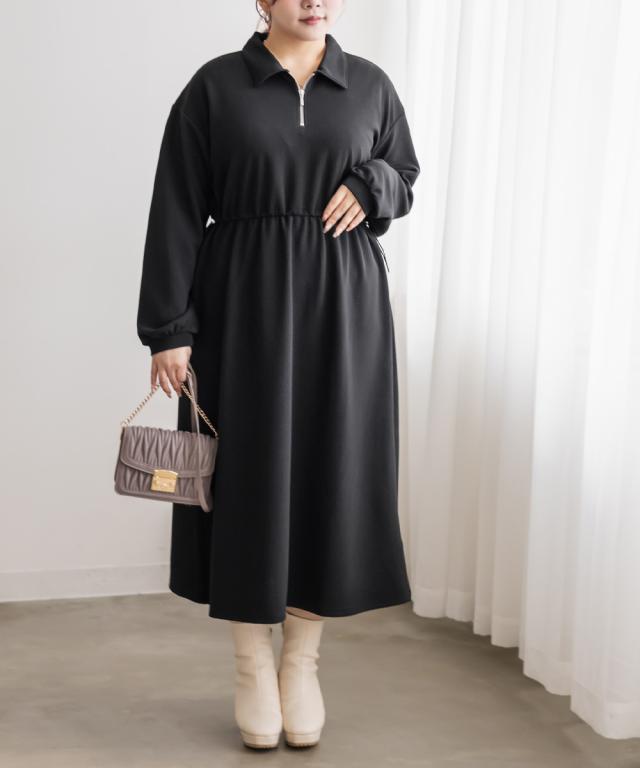 | 3Lサイズを着用してちょうどよいサイズ感でした。軽く伸びのあるきじで動きやすくノンストレスに着用できました。襟とジップデザインが顔回りにメリハリをプラスしてくれます◎ウエストはドロスト出来るのでお好みのサイズ感・シルエットで着用出来ます♪寒い時期はハイネックなどを重ね着しても可愛いと思います!長いシーズン着まわせてらくちんなワンピはコーデに困らず便利なアイテムです! |
