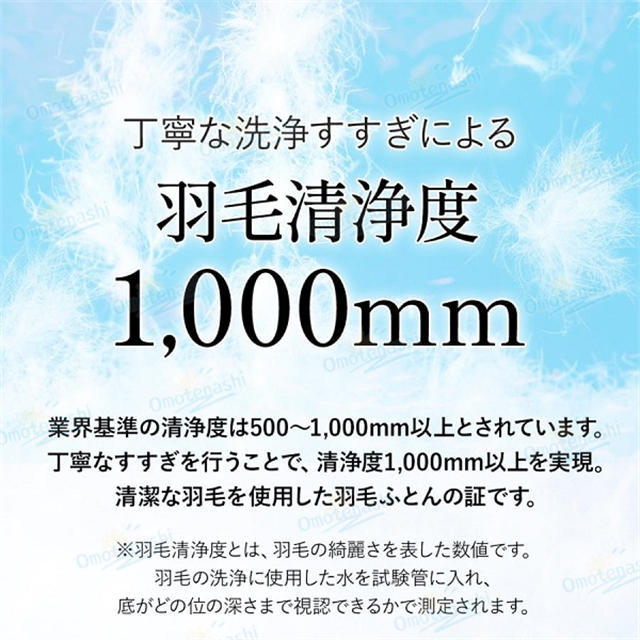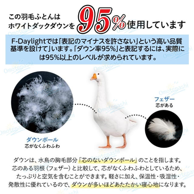 商品説明 羽毛の気持ち良さと軽さ、あたたかさを体感! 羽毛布団を初めて使う方にはこちらがオススメ! 布団に入ったときの気持ち良さにビックリするはず???! あたたかさと軽さが魅力の羽毛布団 ふっくら&清潔&高品質 ぜひこの羽毛布団をお試しください。 ※こだわった洗浄工程により匂いの除去処理を行っておりますが、羽毛は天然素材ですので、完全に無臭ではございません。予めご了承ください。 ※開封直後は、まず十分に空気を含ませて、風通しの良いところで数日に広げて放置していただくと、 この匂いは時間とともに薄れていきますのでご安心ください。 なお、天然羽毛の臭いのため人体に害はございませんので、ご安心ください。