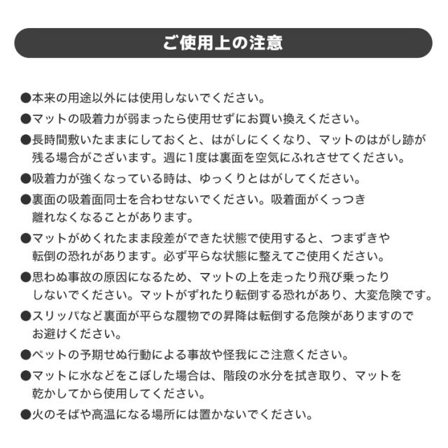 ・マットの吸着力が弱まったら使用せずにお買い換えください。 ・長時間敷いたままにしておくと、はがしにくくなり、マットのはがし跡が残る場合がございます。週に1度は裏面を空気にふれさせてください。 ・吸着力が強くなっている時は、ゆっくりとはがしてください。 ・裏面の吸着面同士を合わせないでください。吸着面がくっつき離れなくなることがあります。 ・マットがめくれたまま段差ができた状態で使用すると、つまずきや転倒の恐れがあります。必ず平らな状態に整えてご使用ください。 ・思わぬ事故の原因になるため、マットの上を走ったり飛び乗ったりしないでください。マットがずれたり転倒するする恐れがあり、大変危険です。 ・スリッパなど裏面が平らな履物での昇降は転倒する危険がありますのでお避けください。 ・ペットの予期せぬ行動による事故や怪我にご注意ください。 ・マットに水などをこぼした場合は、階段の水分を拭き取り、マットを乾かしてから使用してください。 ・火のそばや高温になる場所には置かないでください。 ・日の当たる所で使用しないでください。日焼けで硬化する場合があります。 ・商品は、モニターによって色合いが異なって見える場合があります。 ・仕様・デザインは改良のため予告なく変更することがあります。 |